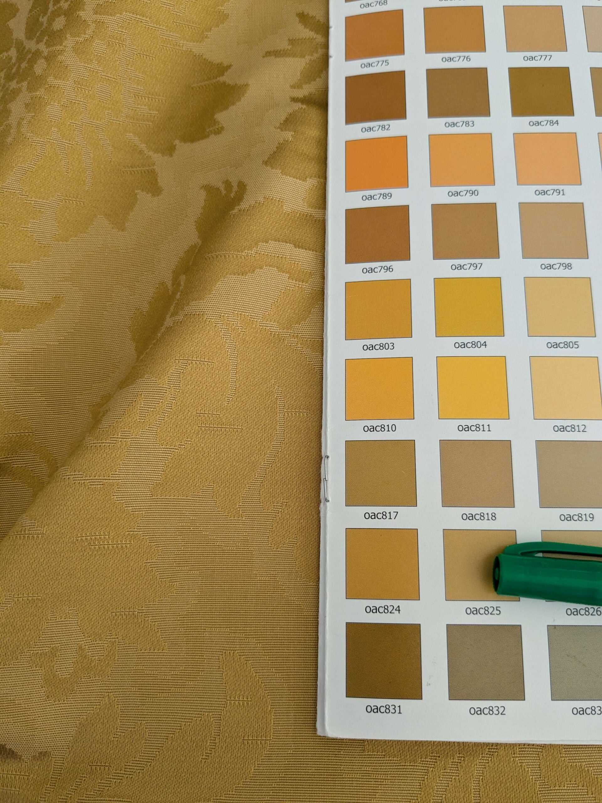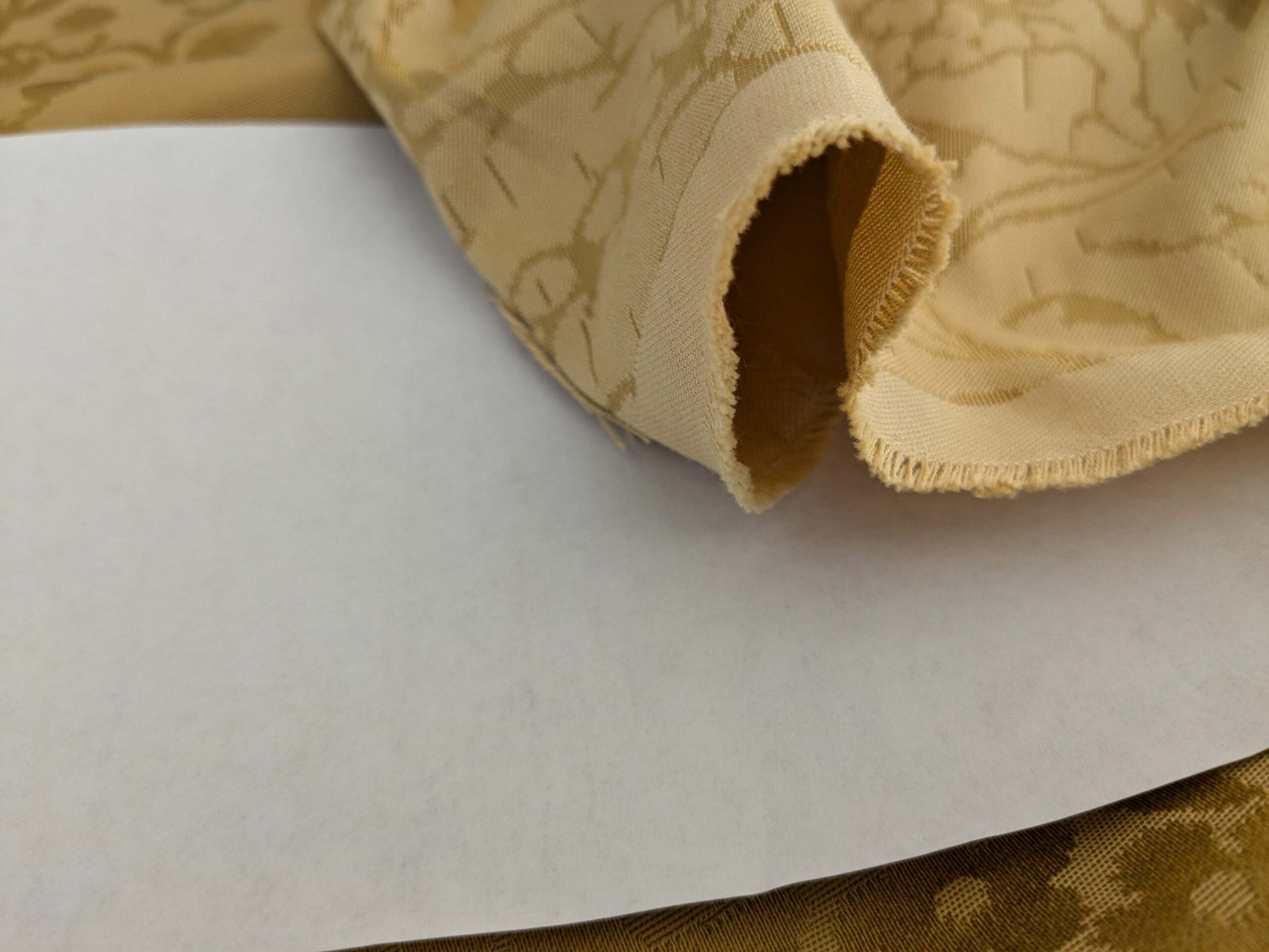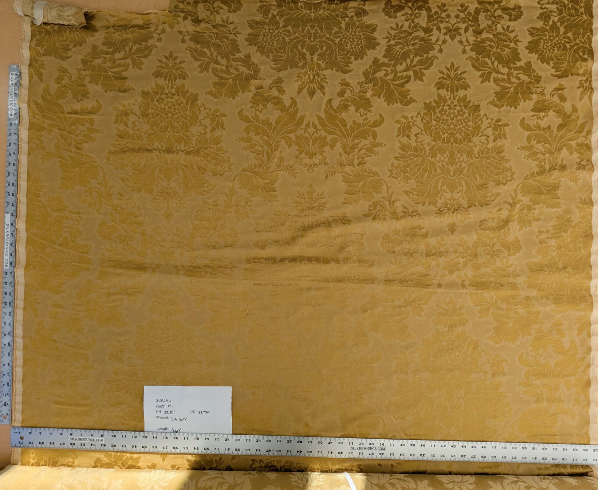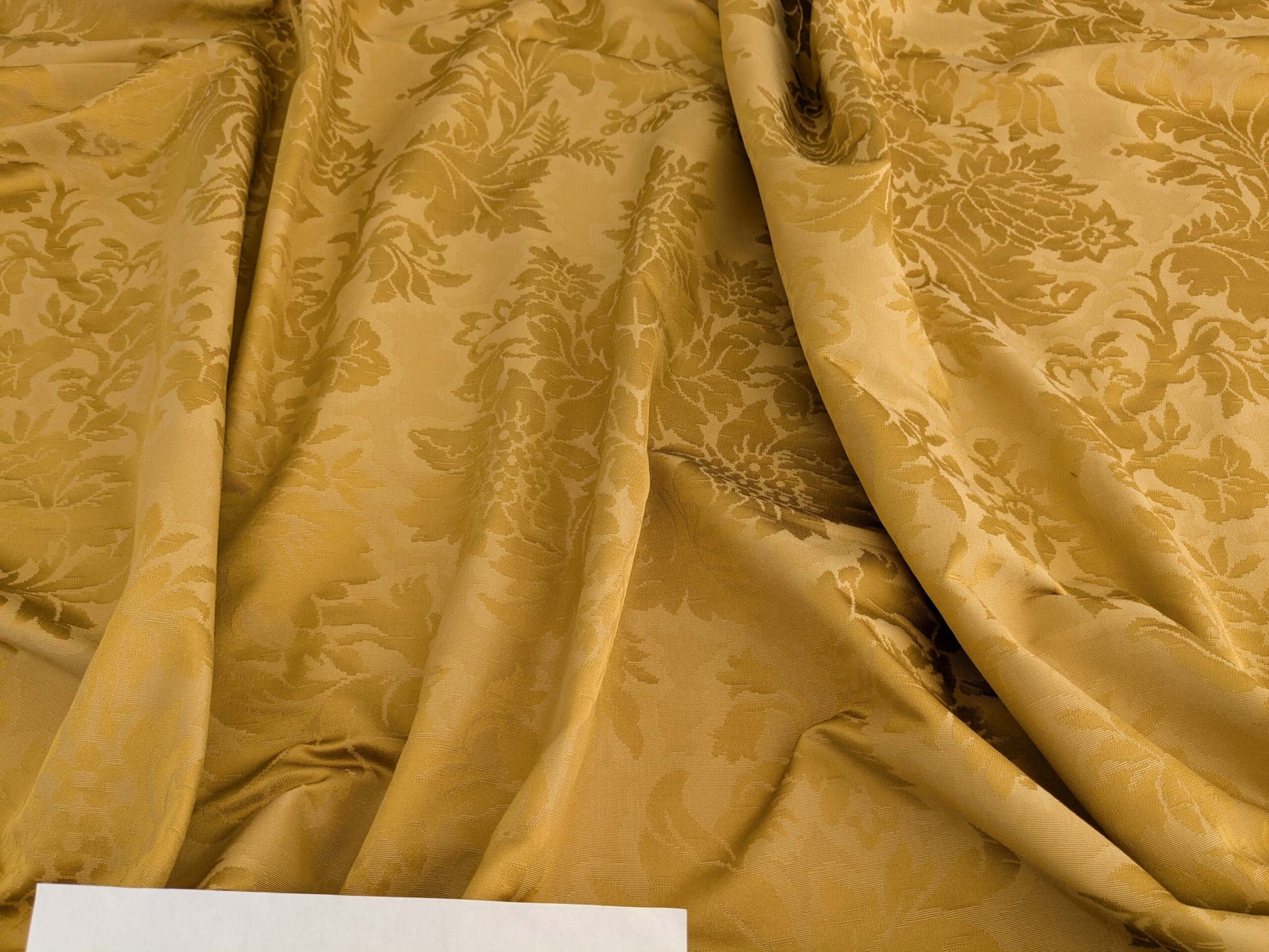 Please see yardage in title & photo. This radiant damask with extra width and silky hand will light up any room. Most likely a cotton or cotton and viscose blend, it features acanthus, rose and artichokes.