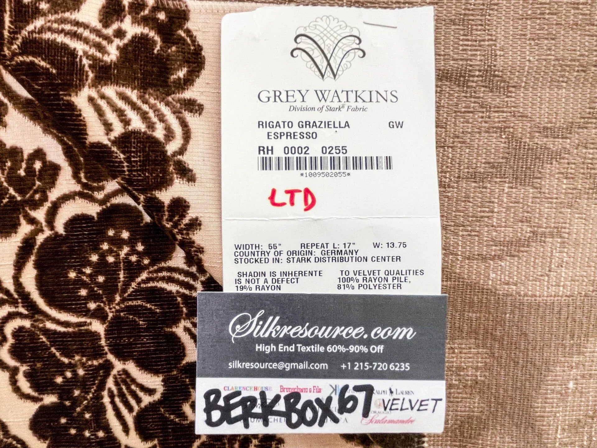 Fiber, repeat, width, weight, country of origin, WHOLESALE price/yard:
