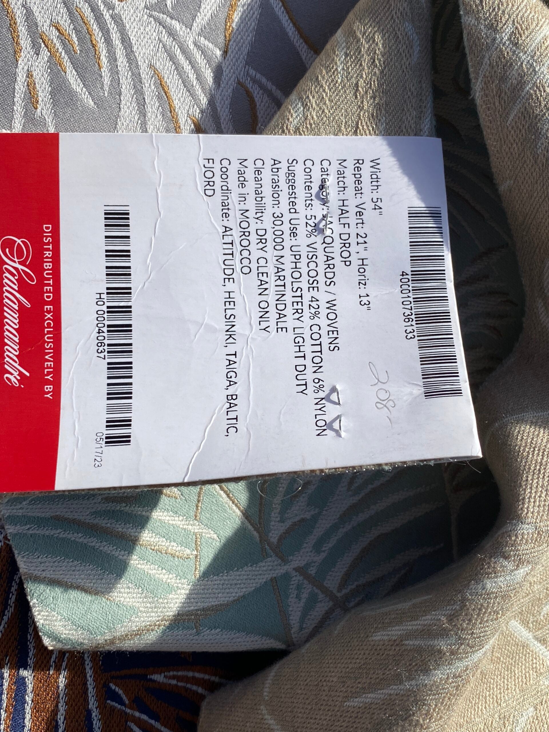 Fiber, repeat, width, weight, country of origin, WHOLESALE price/yard: