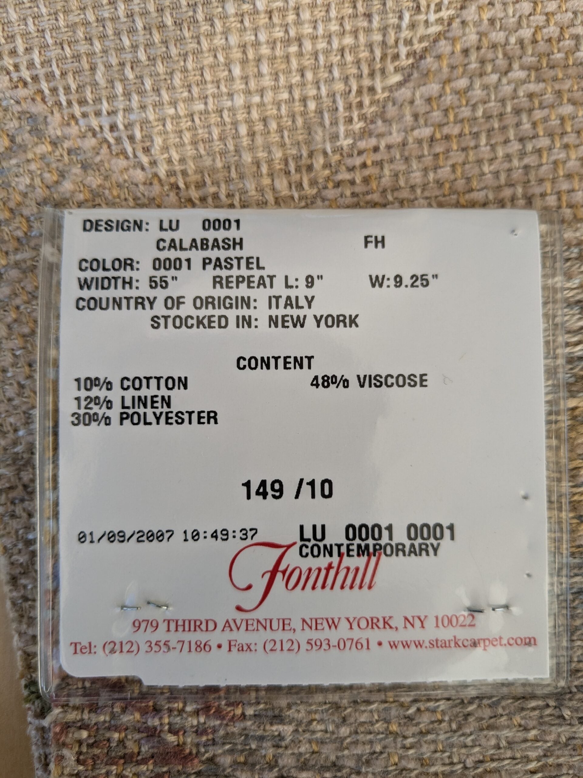 Fiber, repeat, width, weight, country of origin, WHOLESALE price/yard: