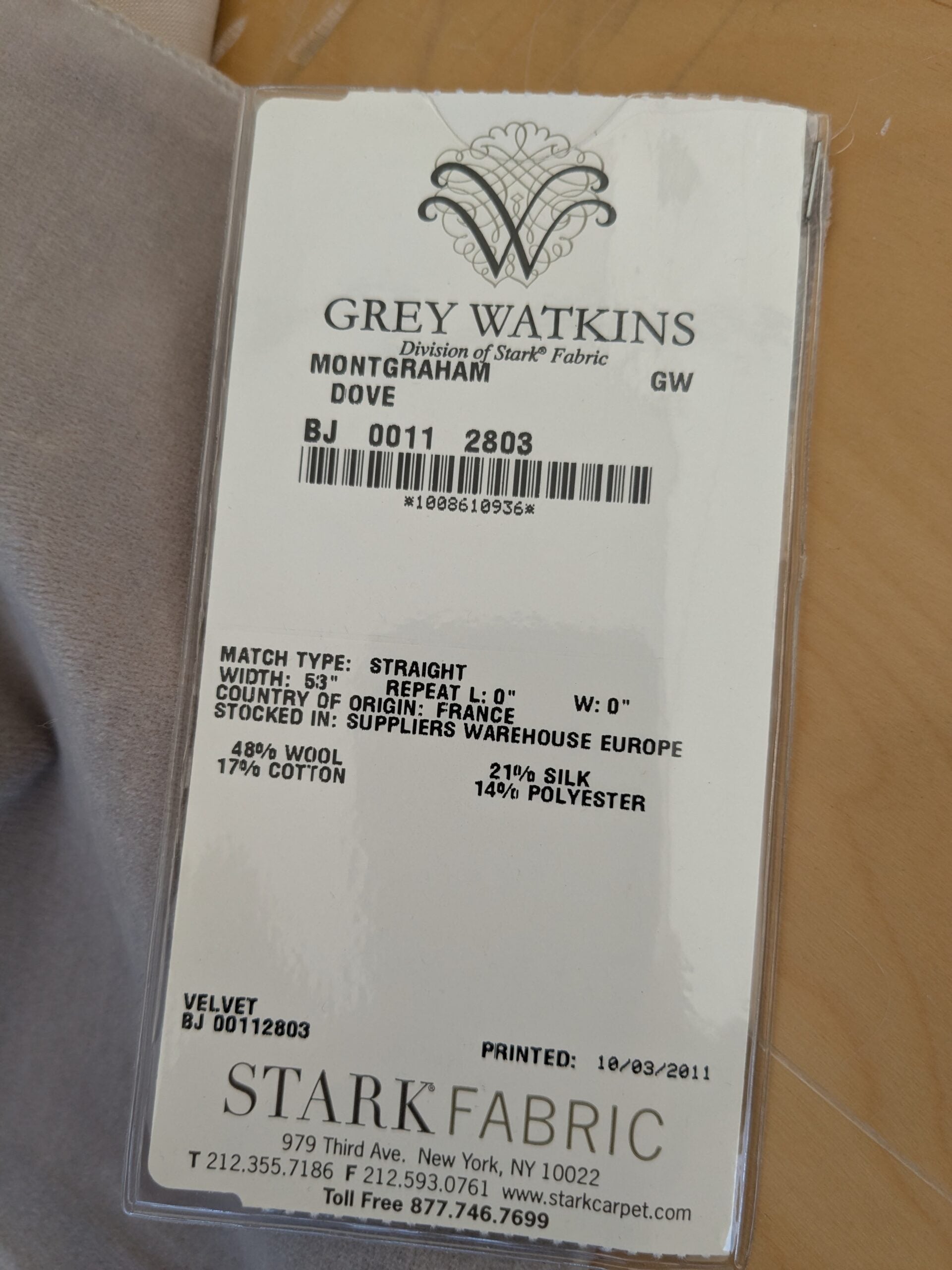 Fiber, repeat, width, weight, country of origin, WHOLESALE price/yard: