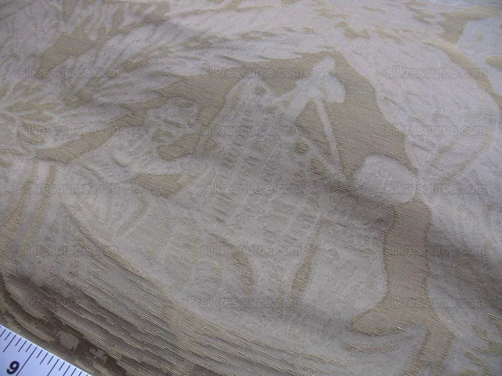 Total available presently: See photo (Yards in photo was the ORIGINAL yards) Designer: Scalamandre/Old World Weavers Very unique silk damask with sea voyage theme. MSRP $192/yard+ tax a few years back (official number from Old World Weavers) Our price is below wholesale and even production cost! Fits the BEST antiques. The pattern's different colors really pop out from various angles. Color, repeat, fiber content, applications & retail price: please see the printout in photo. Weight: medium weight silk . Drapery & upholstery (with backing). Soft, durable & crisp