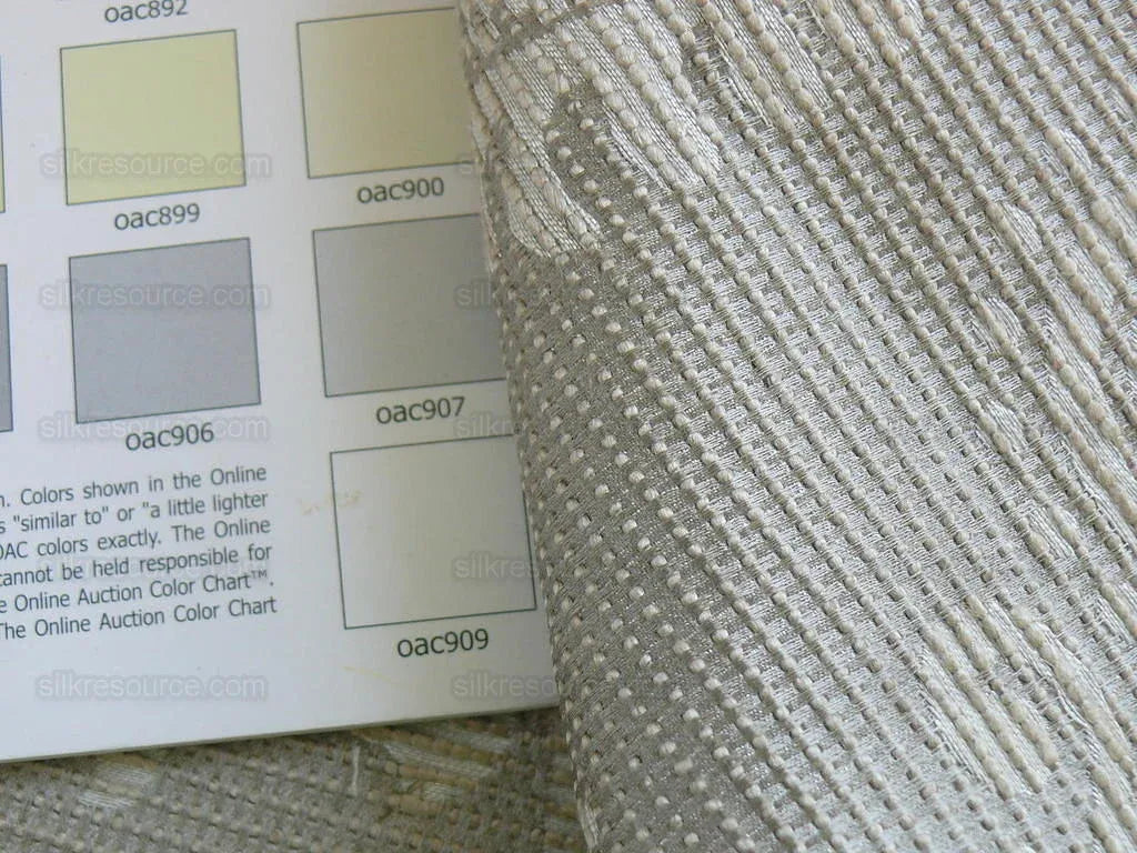 by CHRISTOPHER HYLAND Stunning is not enough of a word here. Width52", HR26", VR32.5", Pattern: 'Constantino'. Colors: Silver, grey, off white Fiber content: 77% Linen, 12% Viscose, 11% Silk. MSRP: about $500/yard Durability : medium- heavy duty. Drapery & upholstery. backed with knit. Color: See color chart in photo. Cool pale silver & off white.