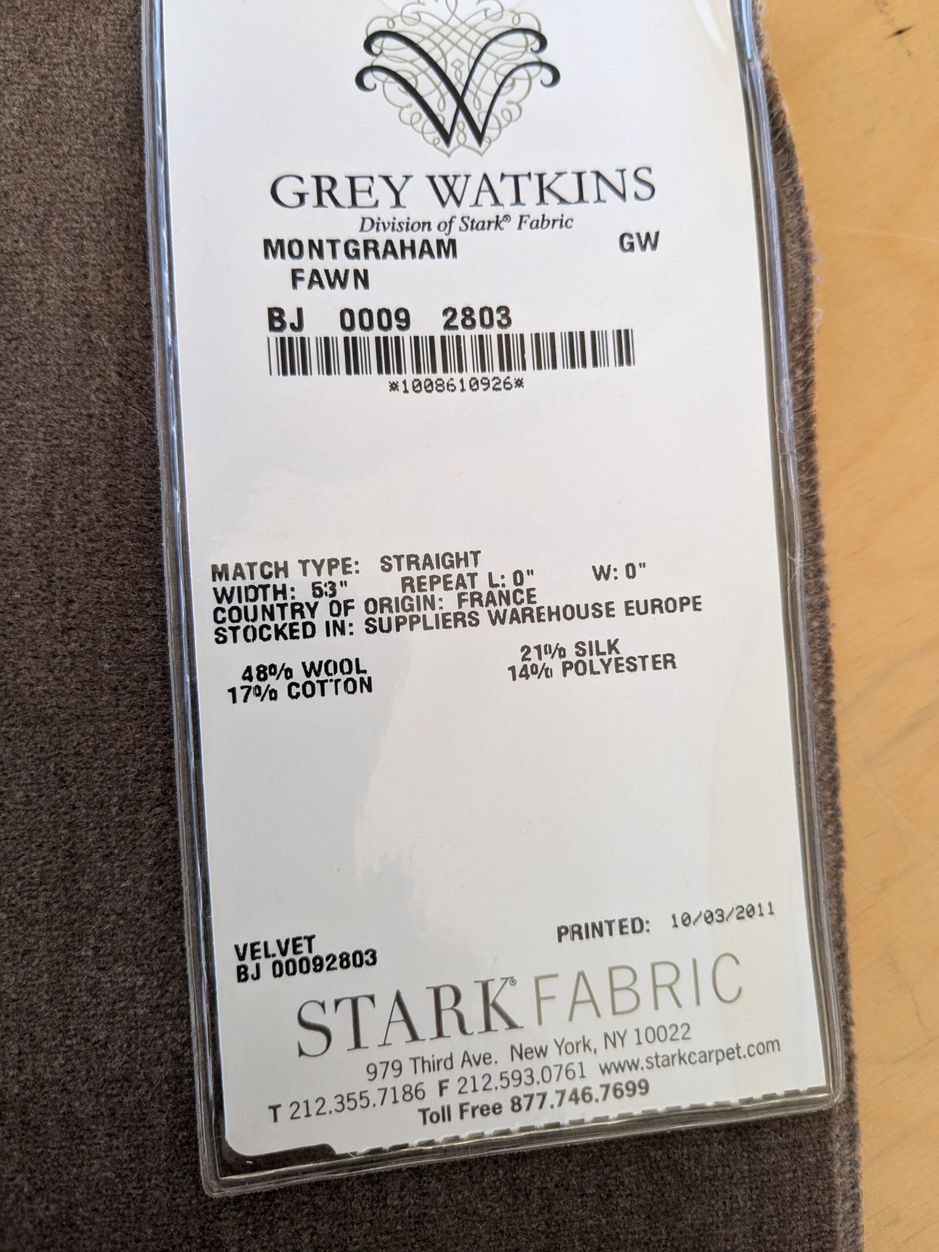 Fiber, repeat, width, weight, country of origin, WHOLESALE price/yard: