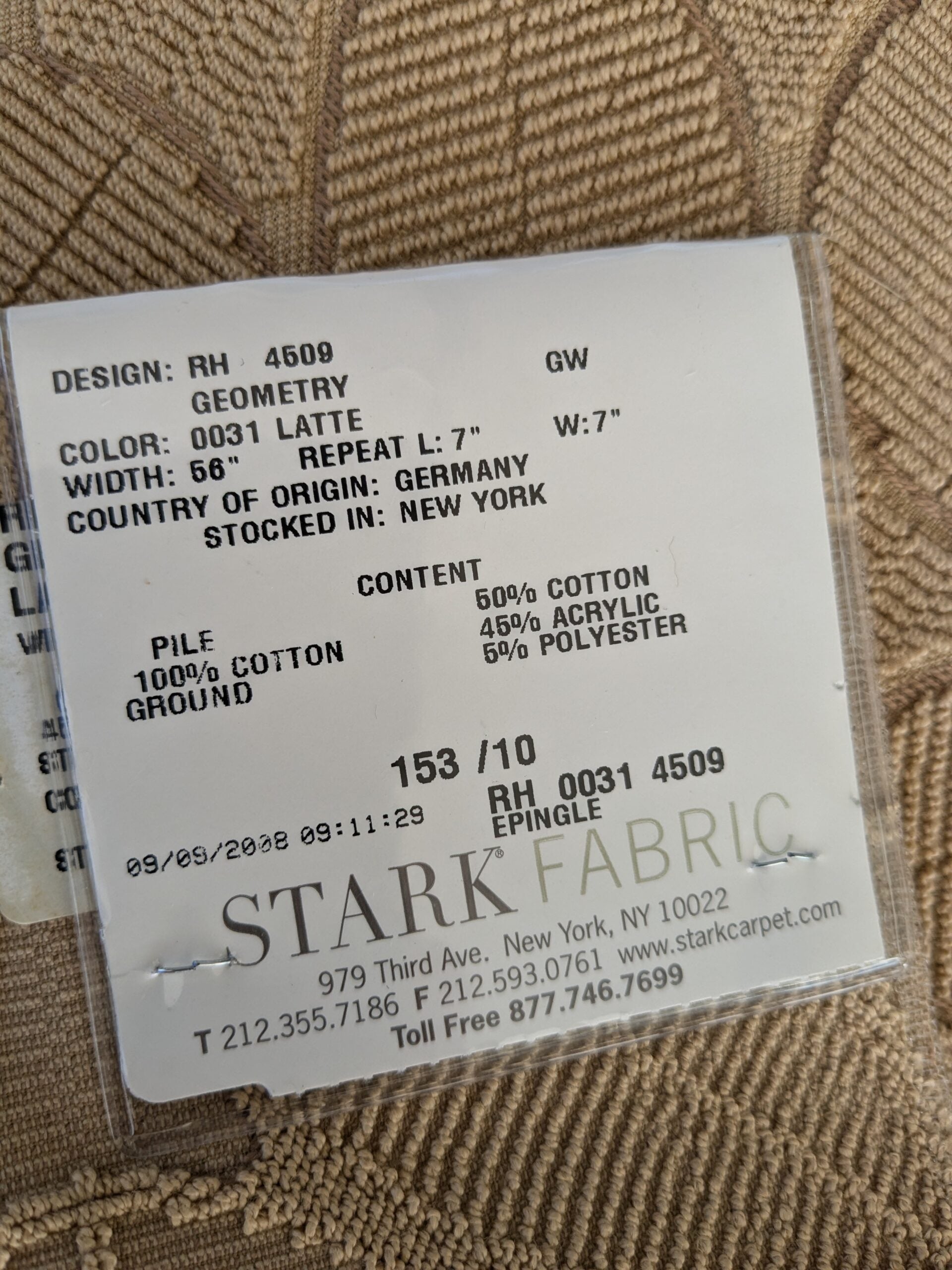 Fiber, repeat, width, weight, country of origin, WHOLESALE price/yard: