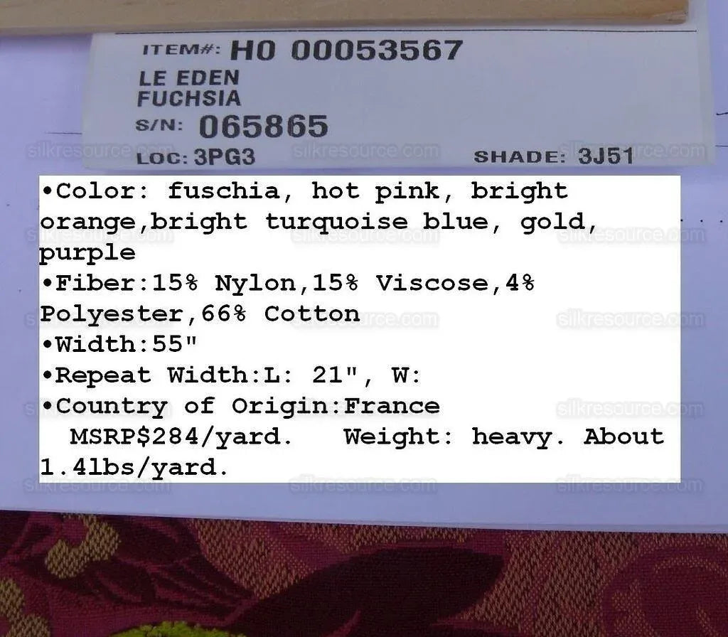 Fiber, repeat, width, weight, country of origin, retail price/yard: