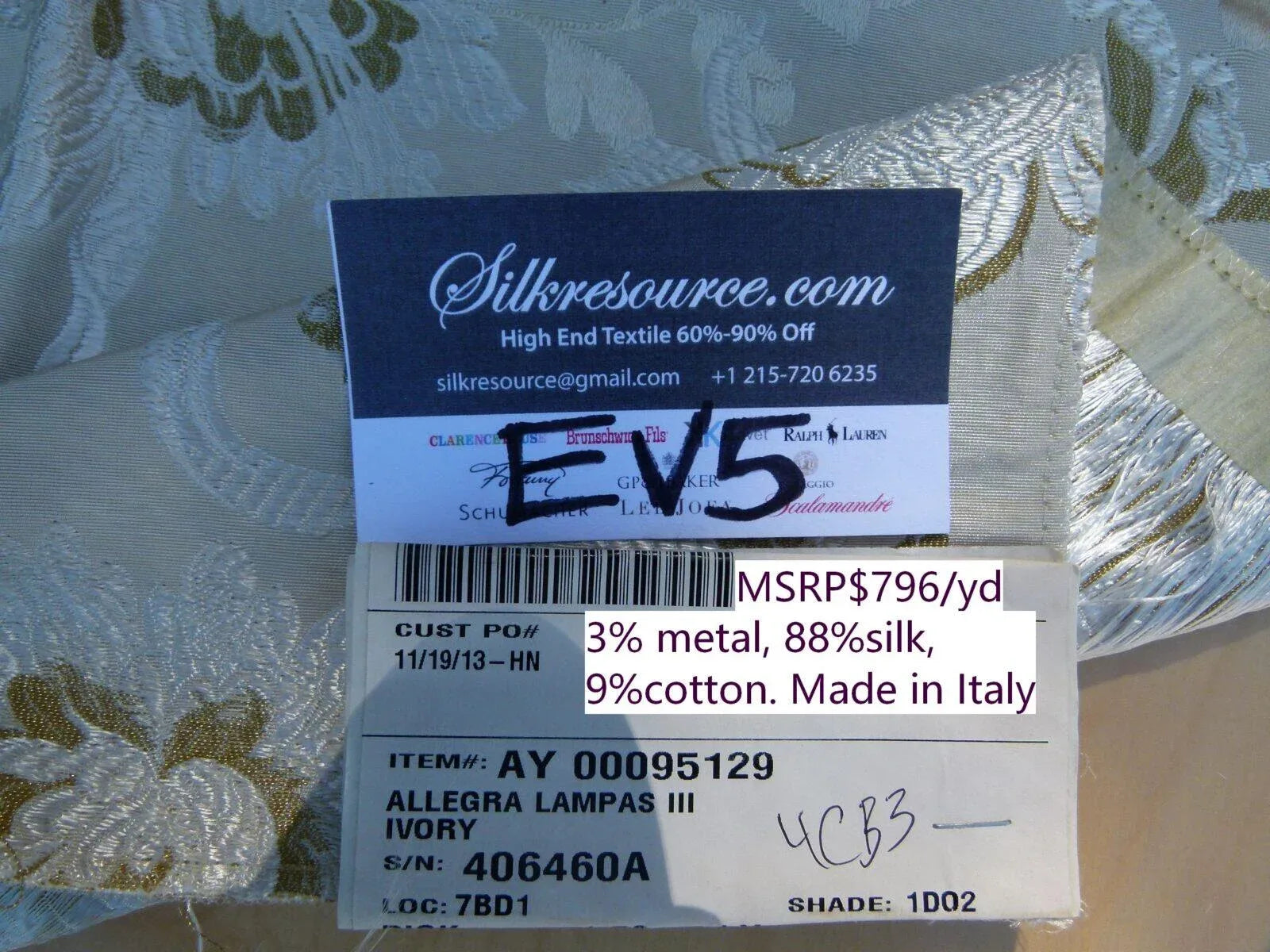 6 Ev5 Scalamandre Square Showroom Sample Allegra Lampas Iii Ivory Silk Metal Foliage MSRP USD 796/Y