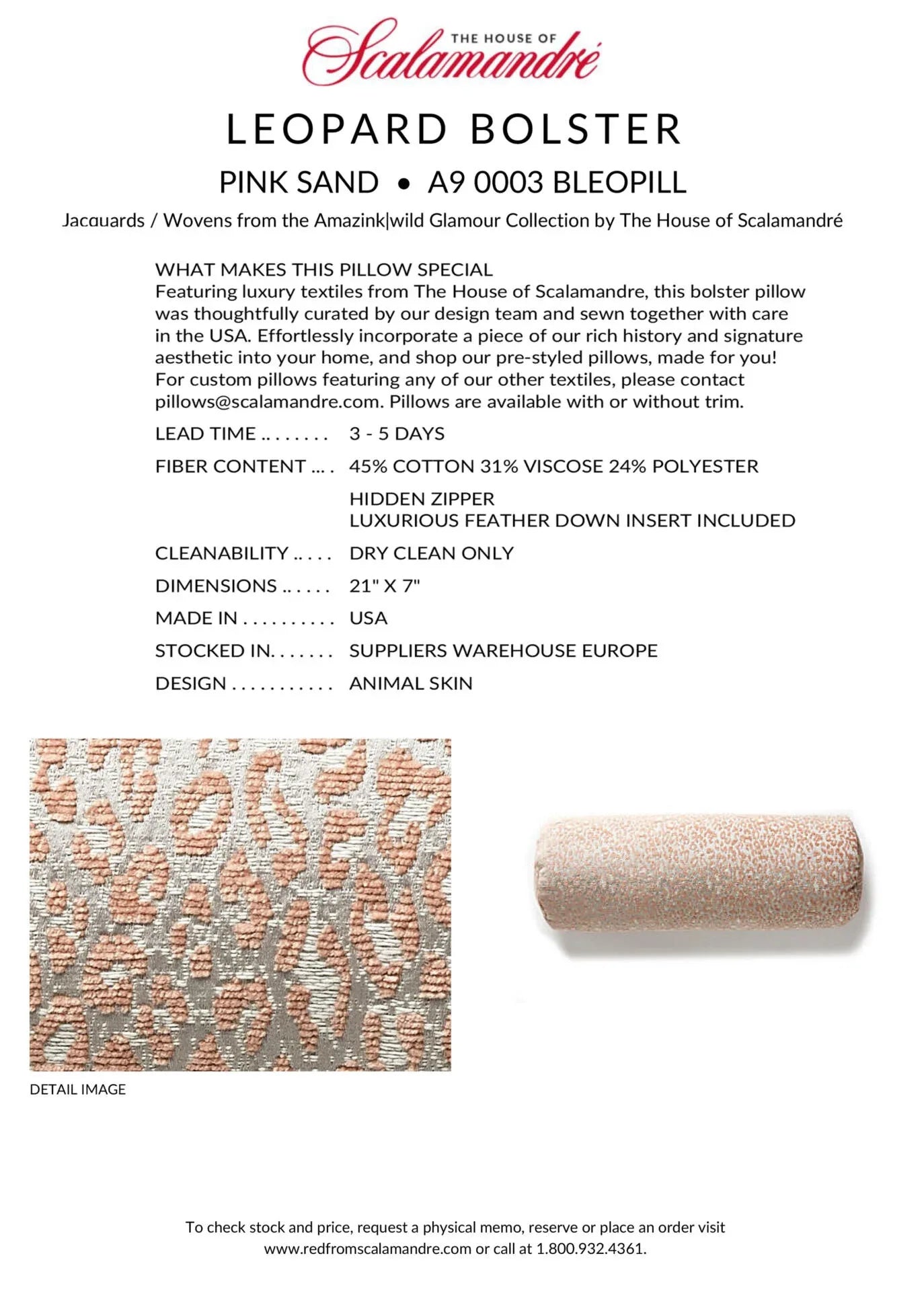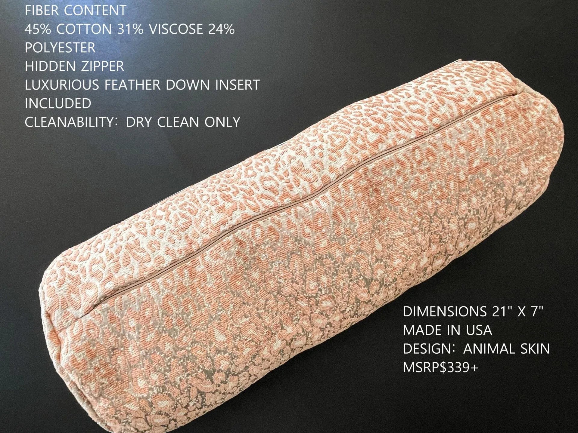 PILLOW 21"x7" Scalamandre LEOPARD BOLSTER PINK SAND Animal Skin MSRP USD339+