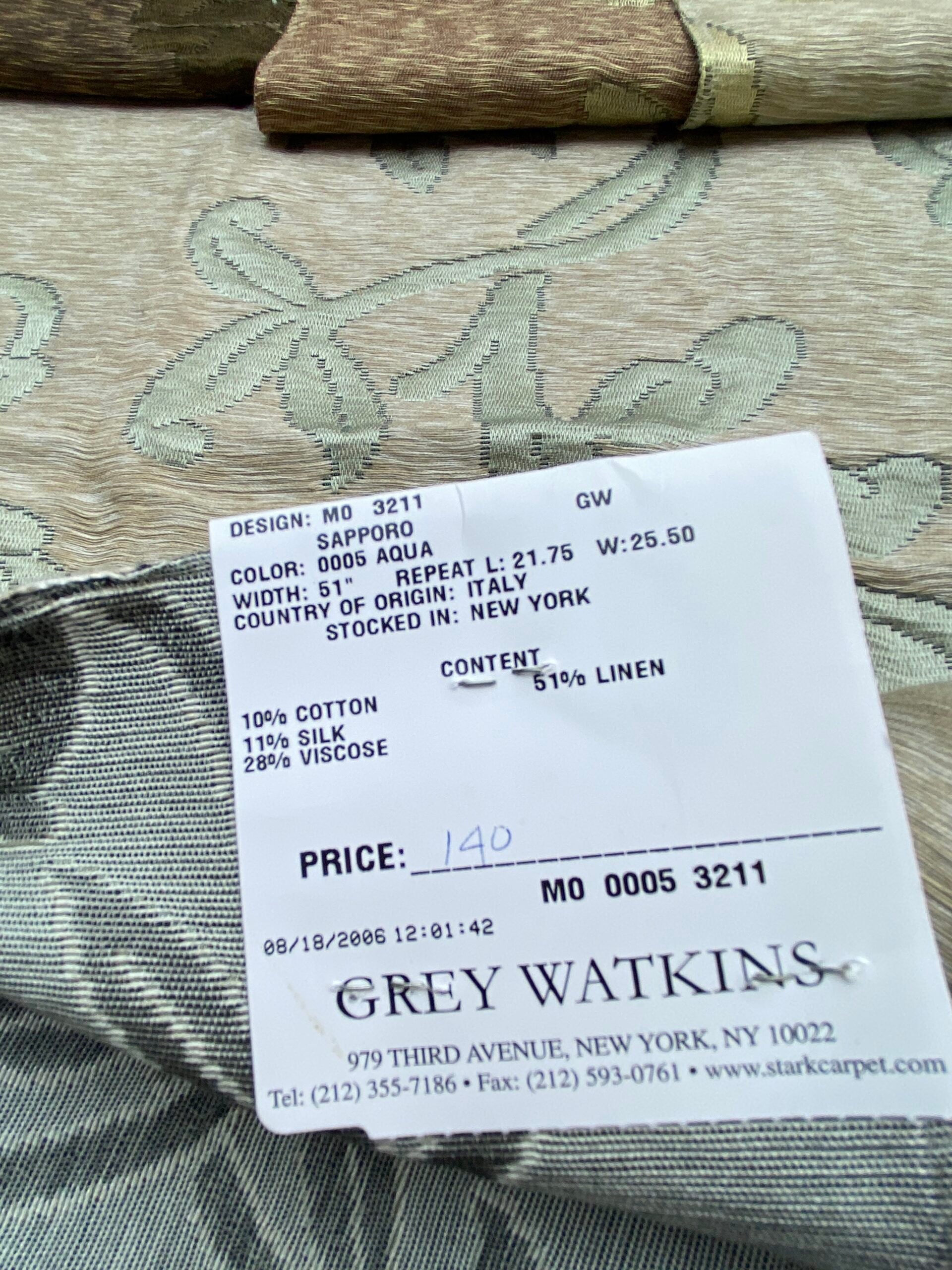 Fiber, repeat, width, weight, country of origin, WHOLESALE price/yard: