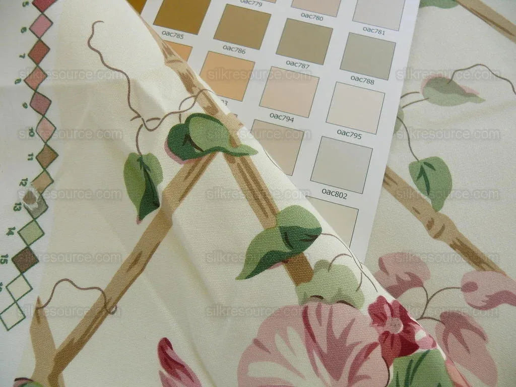 background is palest butter/cream. Prints in various pink, green, tan & brown.