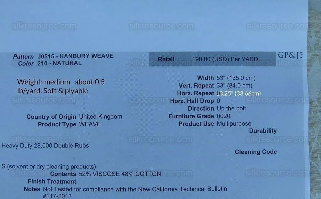 Fiber, repeat, width, weight, country of origin, retail price/yard:
