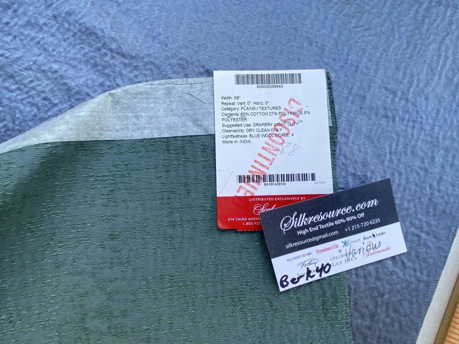 Fiber, repeat, width, weight, country of origin, WHOLESALE price/yard: