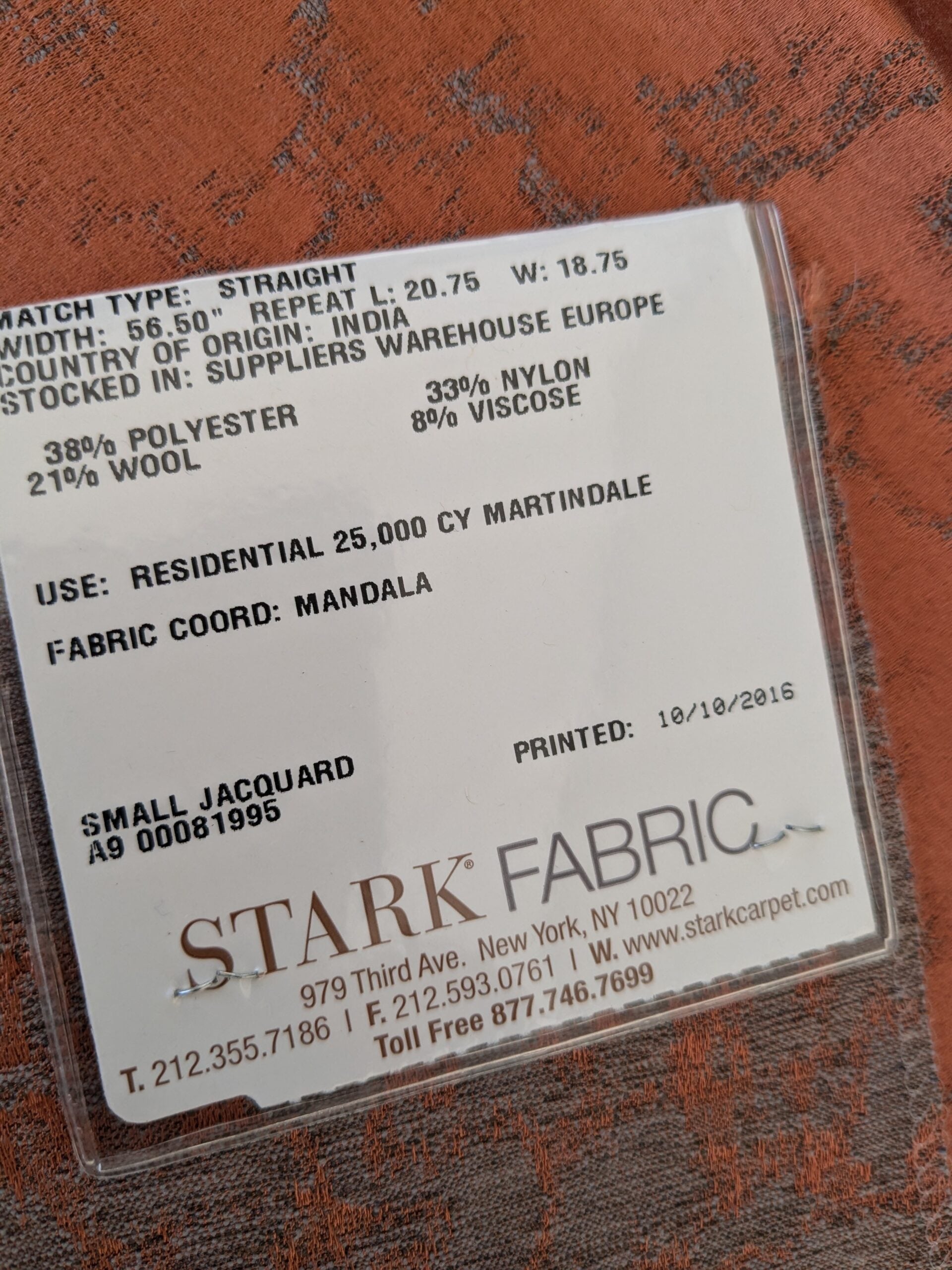 Fiber, repeat, width, weight, country of origin, WHOLESALE price/yard: