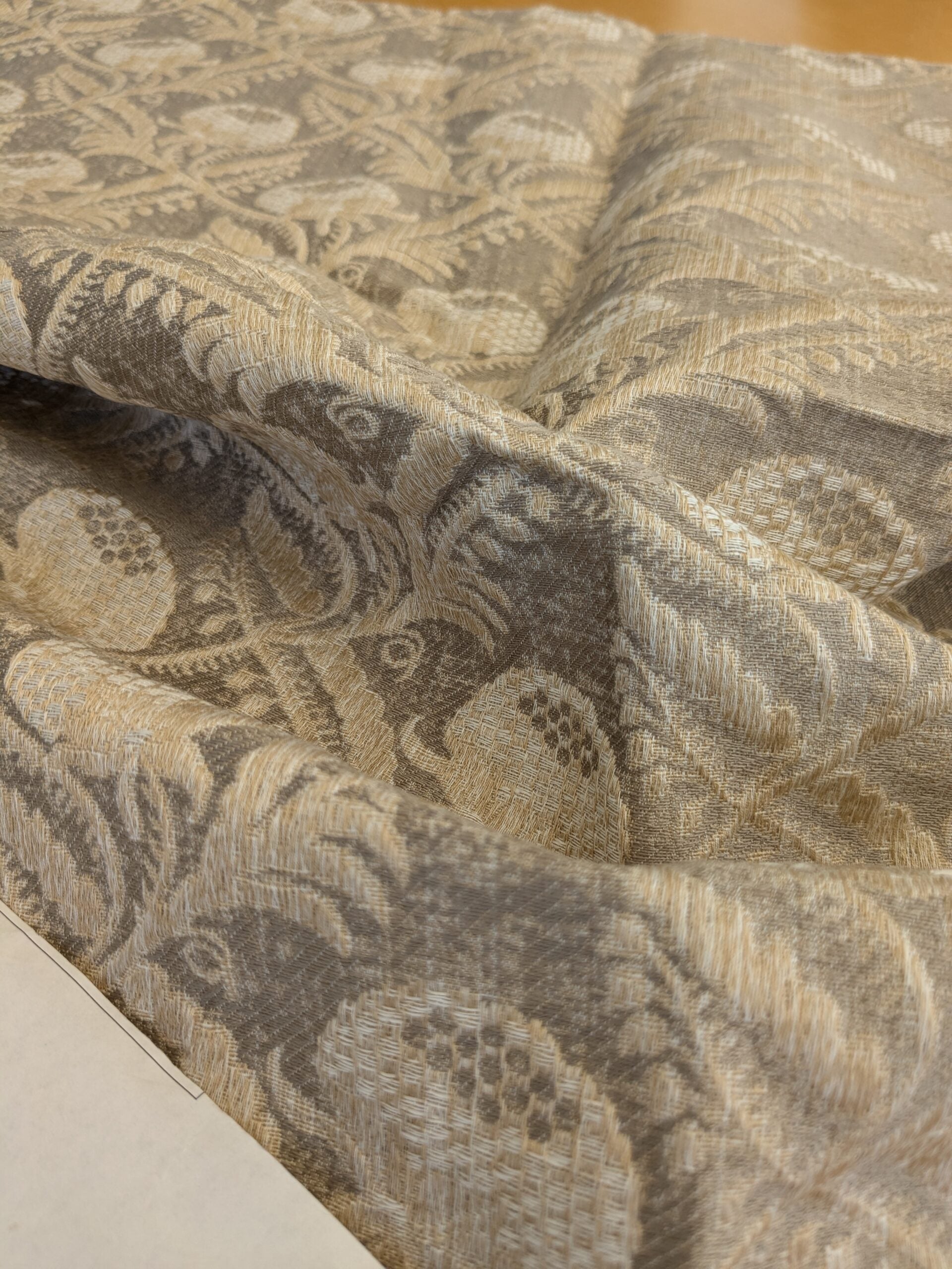 Boutonniere,a historical design from Italy, captures the rhythmic beauty of nature. Mini pomegranate arranged into the lattice of foliage and berries, its scale is highly versatile for drapery, large sofa, small ottoman, chair seats or pillows. The dynamic pattern is both lively and calming.