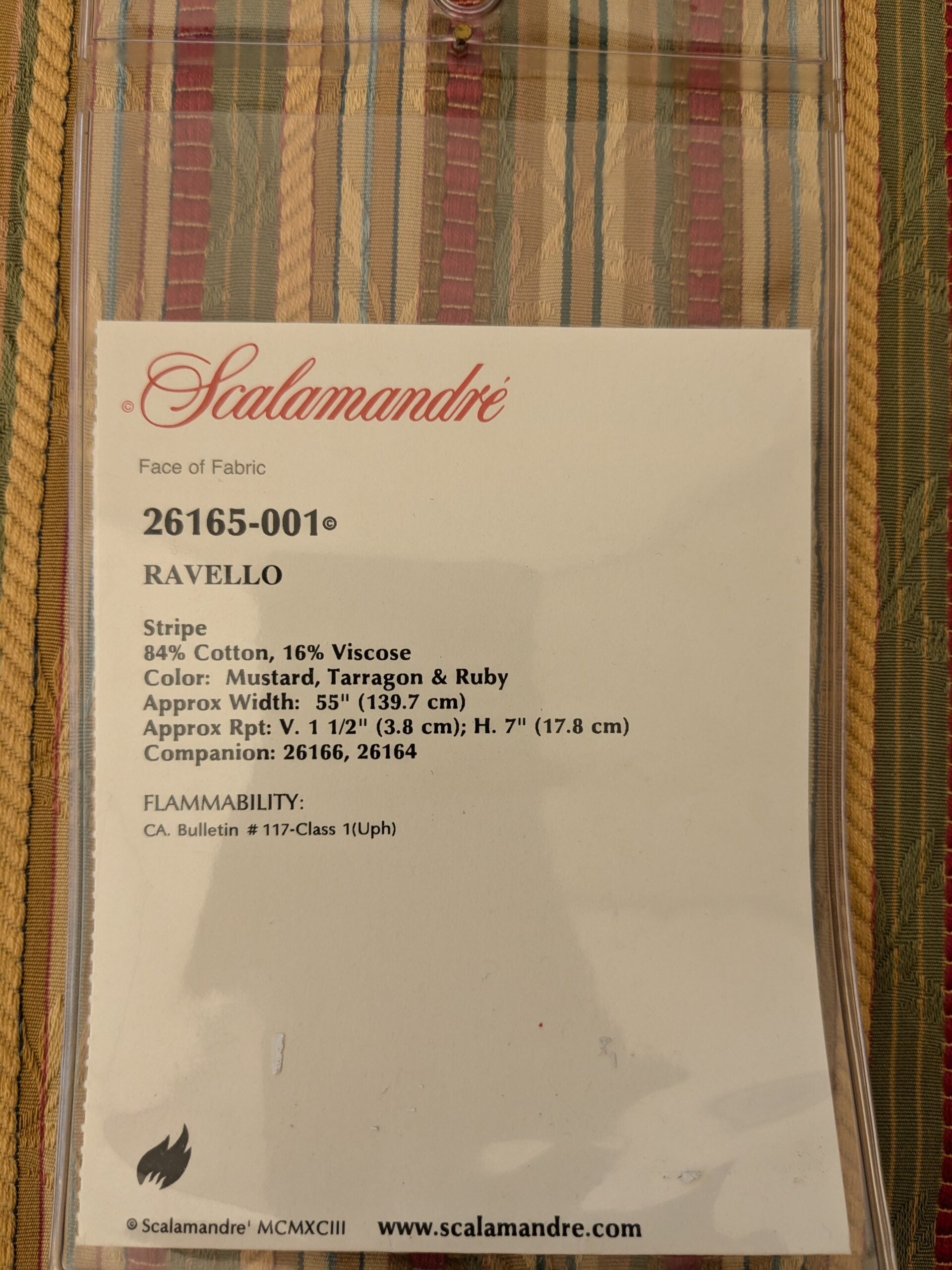 99 EV47 Square Scalamandre Ravello Stripe Mustard Tarragon and Ruby Cotton Green Beige Red