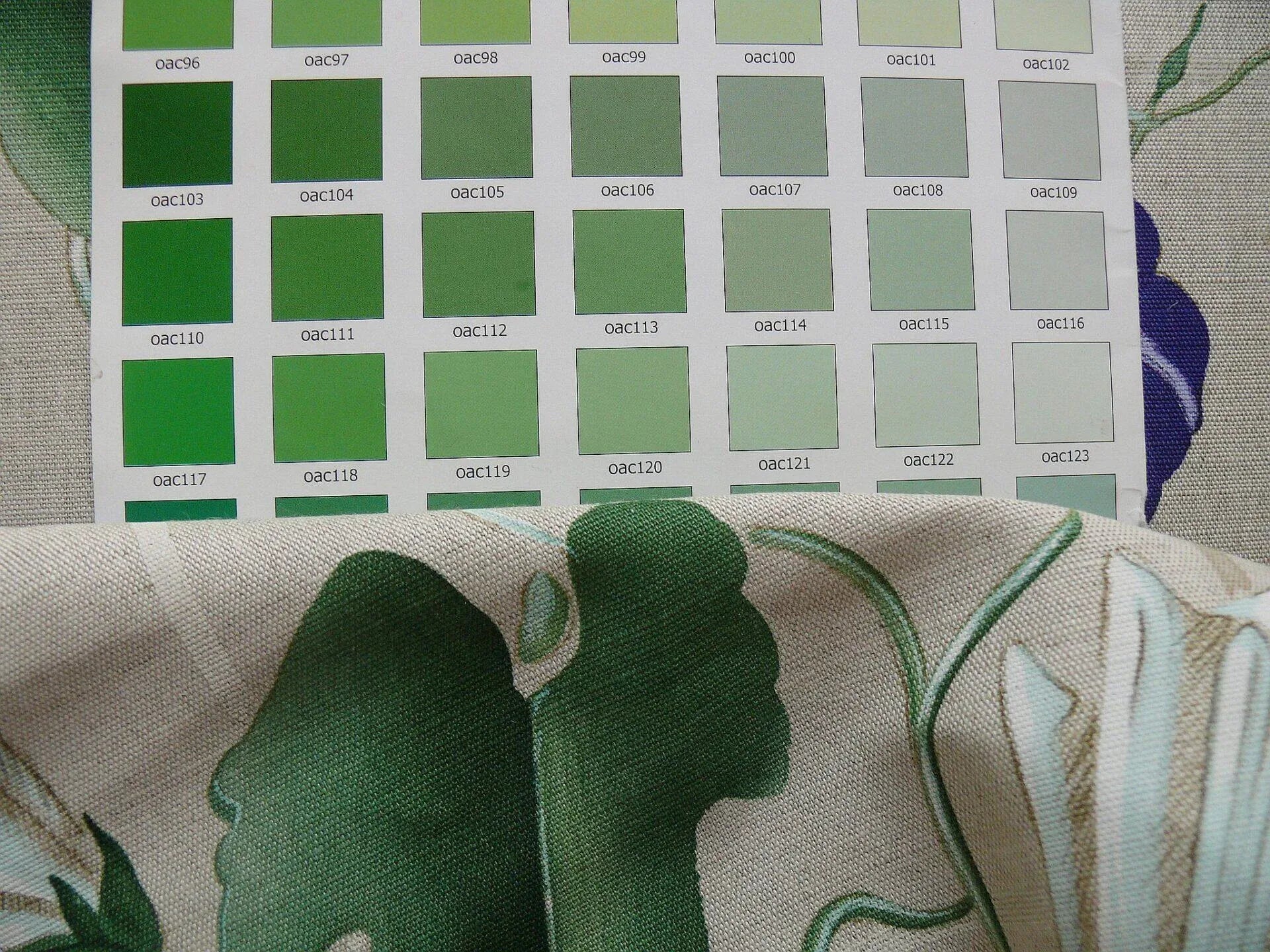 Prints in purple, green, white.