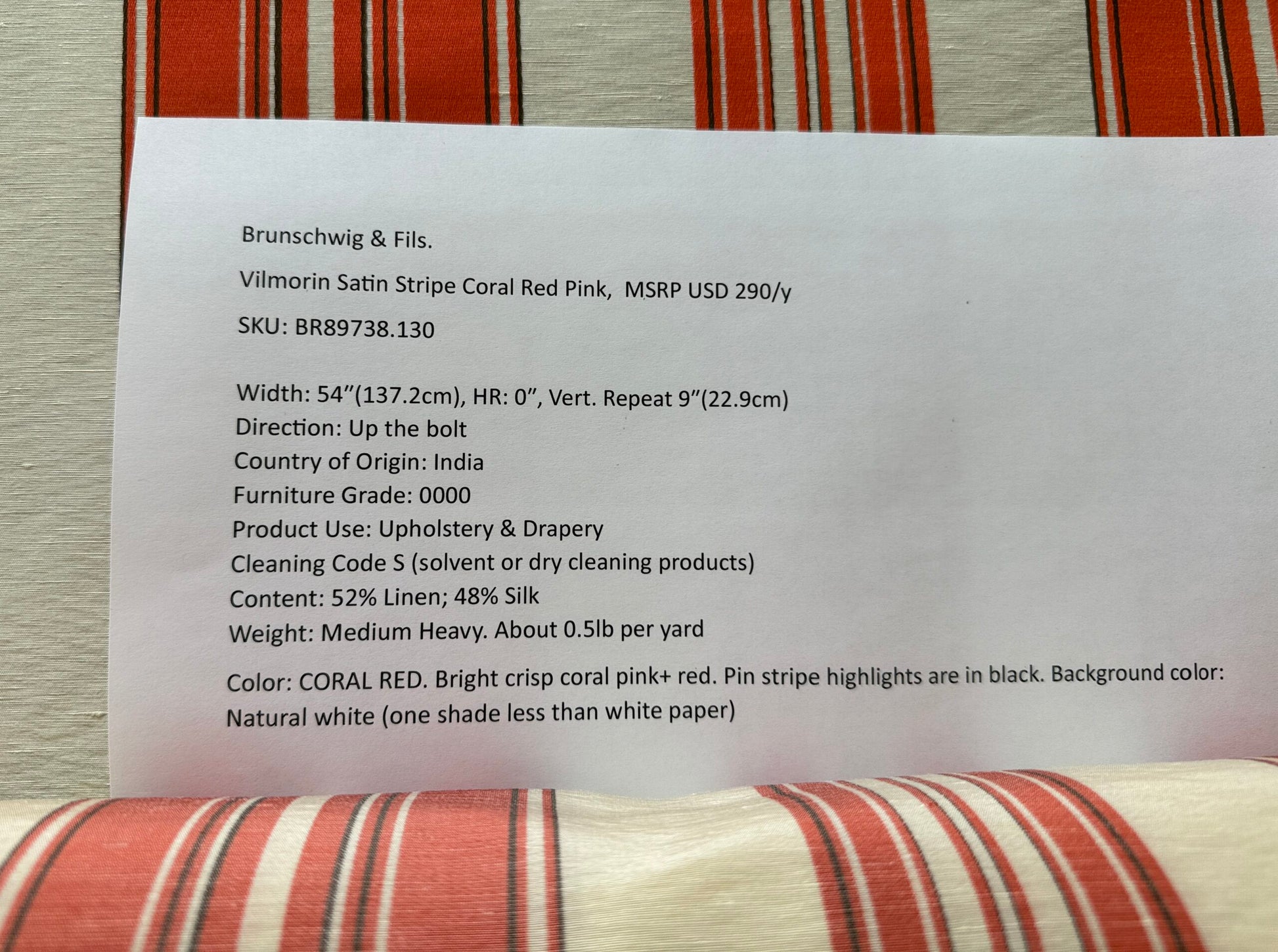 Brunschwig & Fils Vilmorin Satin Stripe Coral Red Pink MSRP USD 290/y by yard