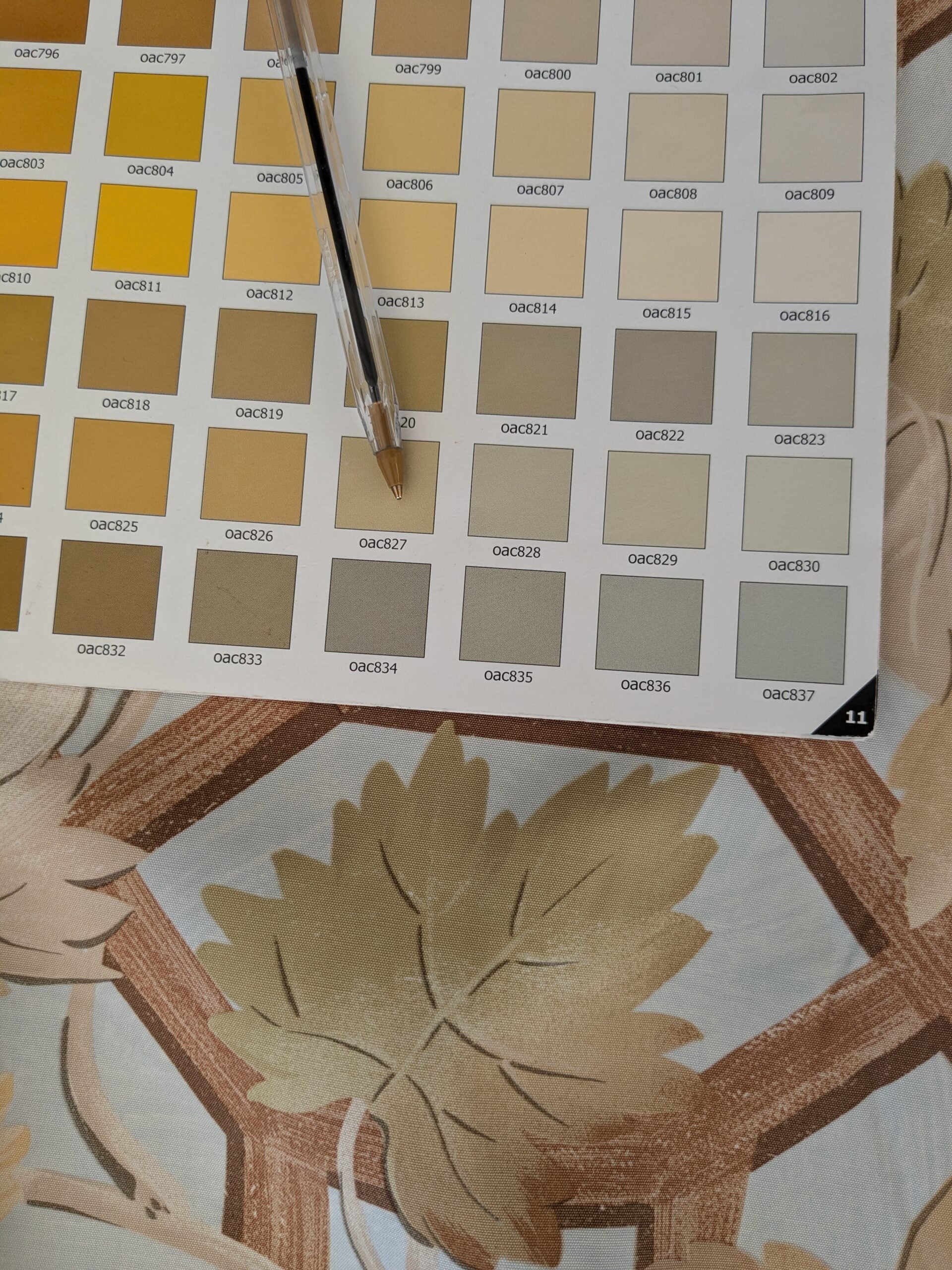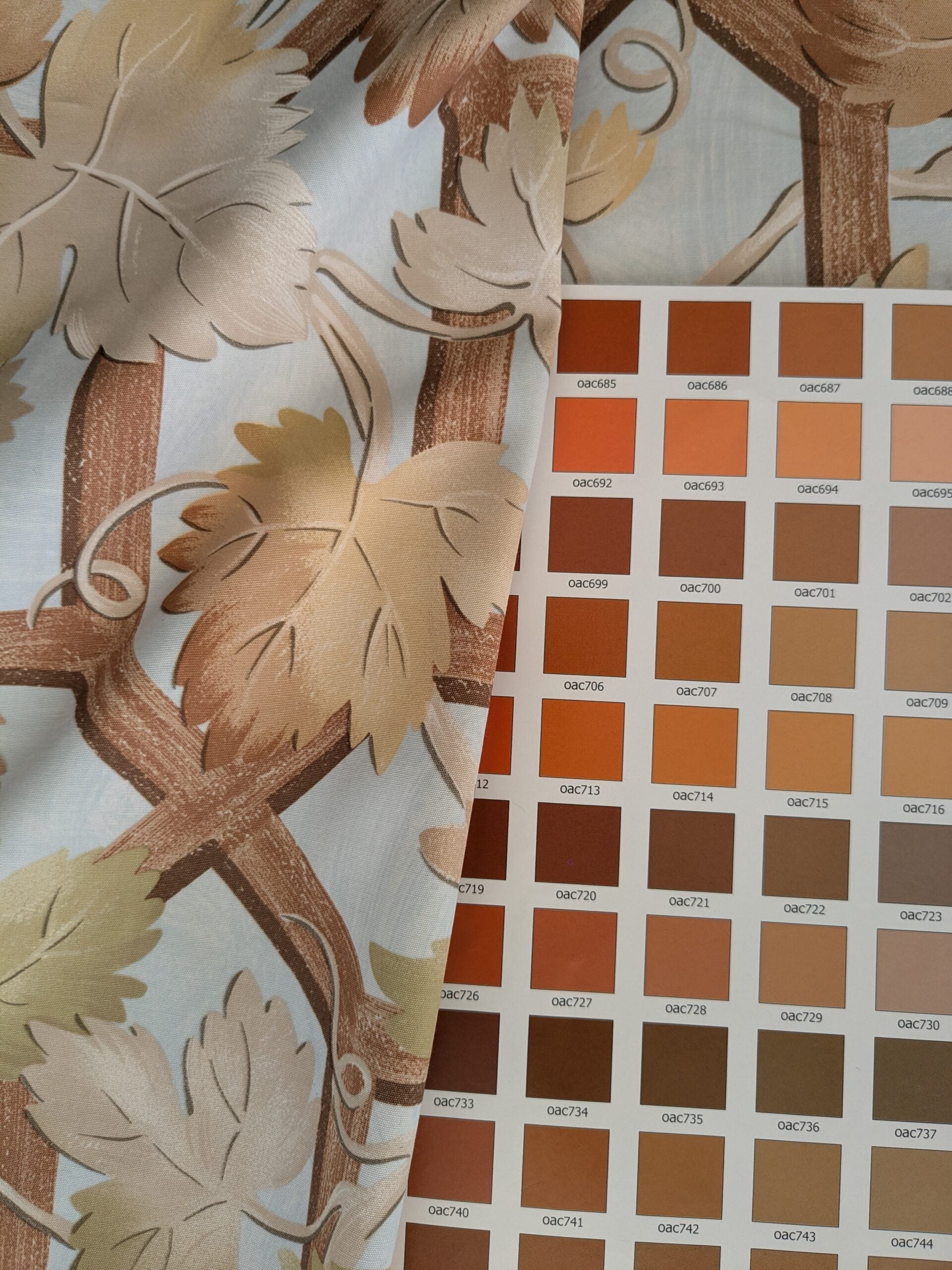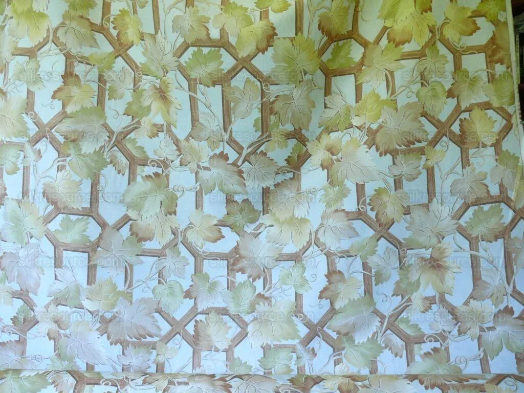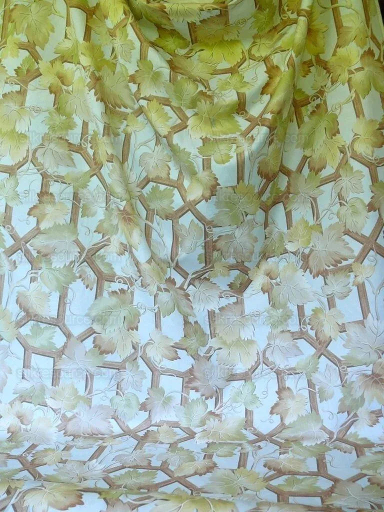 Vite captures the beauty of early fall in the vineyard when air is more crisp and leaves start to turn grey, brown and earthy red. The palette for this print is quite transparent rather than heavier and saturated as most autumn prints are.Vite will be fantastic for a viticulture estate or Thanksgiving tablecloth.Beautiful grape foliage on lattice. 100% cotton print. Total of 15 screens! Very time consuming to create. Combed cotton, almost satiny. Substantial weight, about 0.4lb per yard. Although thin, this is very durable & can be used for heavier traffic upholstery.Smooth & crisp. Great for drapery & upholstery---or even better, wall-covering! Made in France.Color: very pale blue, prints in many shades of green, brown, beige. MSRP: such prints from B & Fils goes for at least $300/yard. Width 57.5" HR 55.75" VR 35.5" Application: drapery and upholstery |