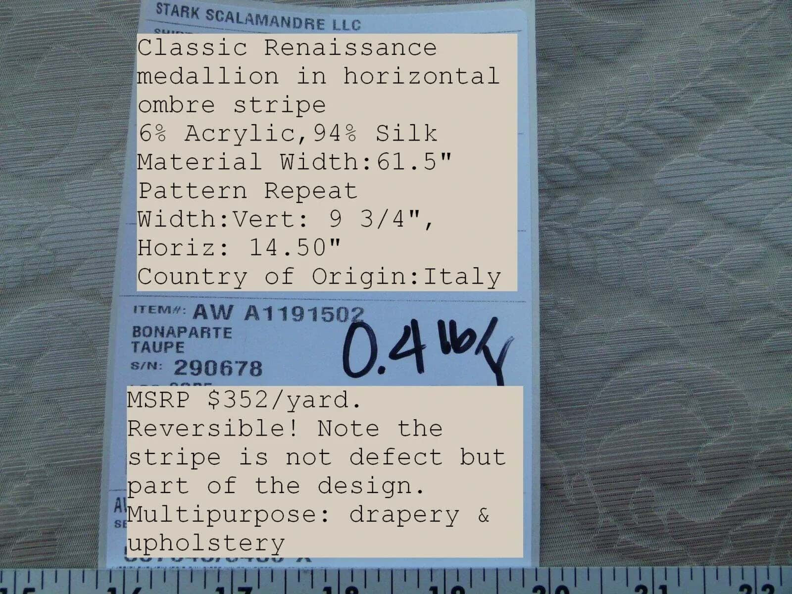 By Yard Bonaparte Taupe Scalamandre Silk Italy MSRP USD 352/Y