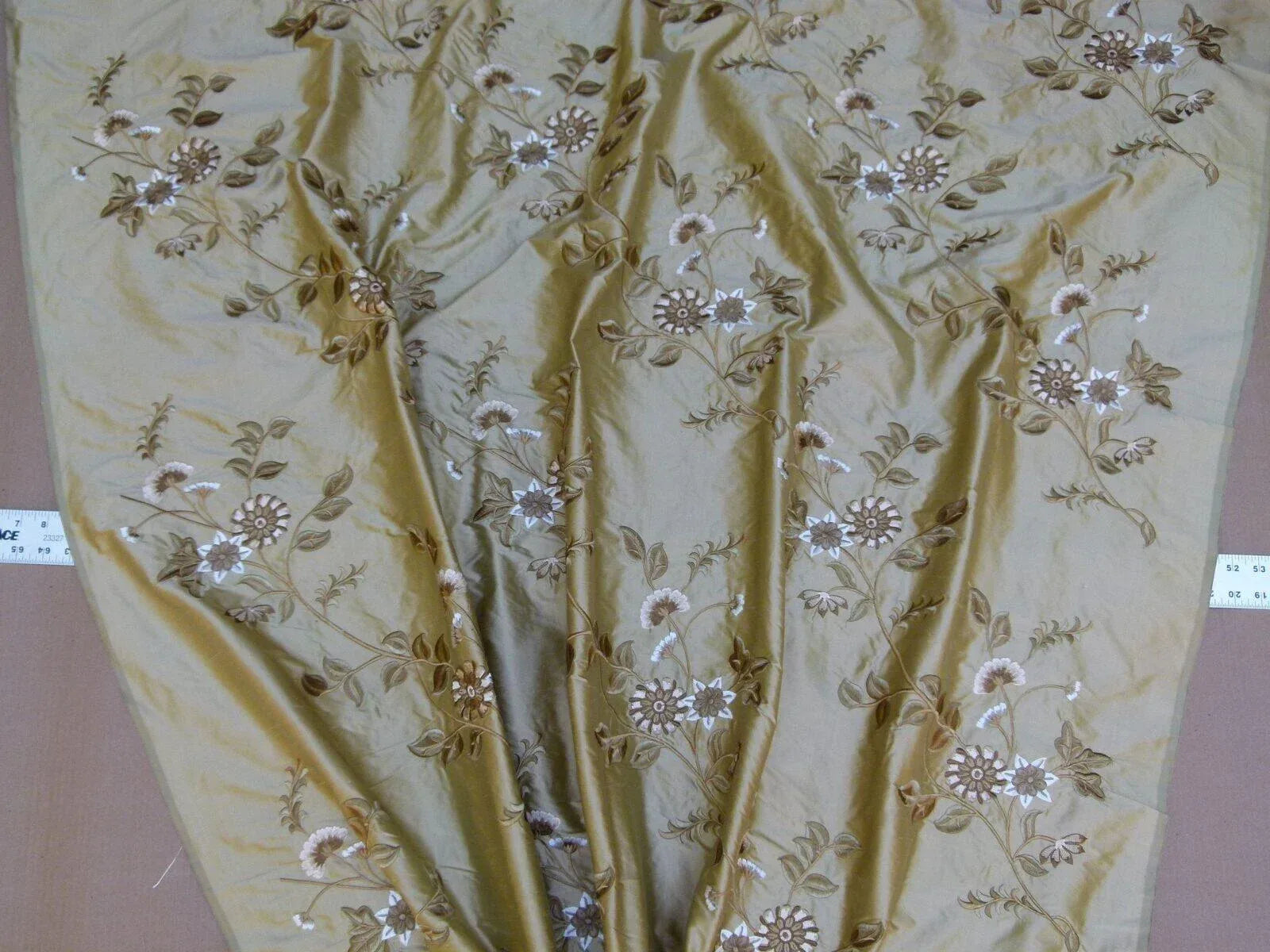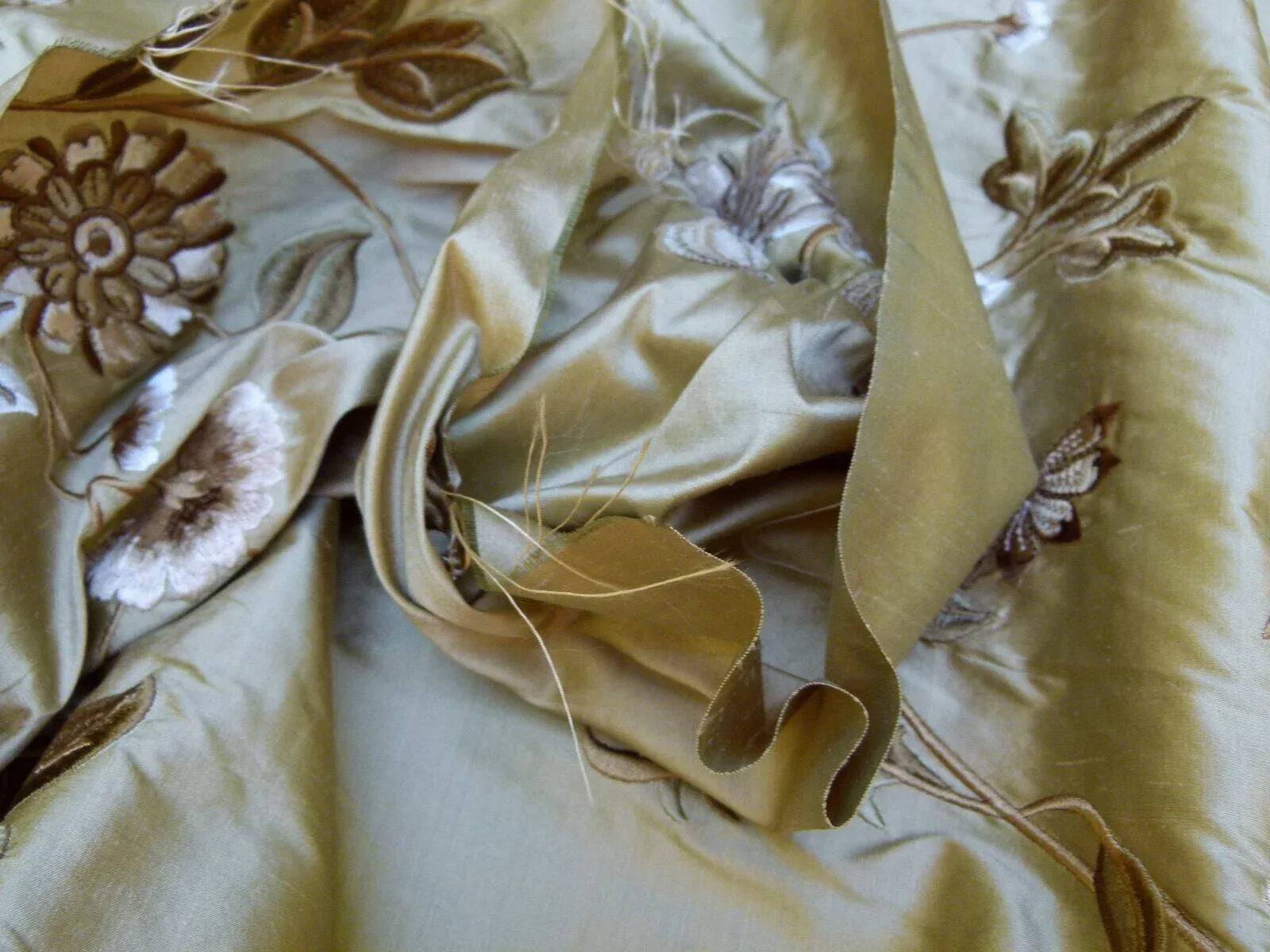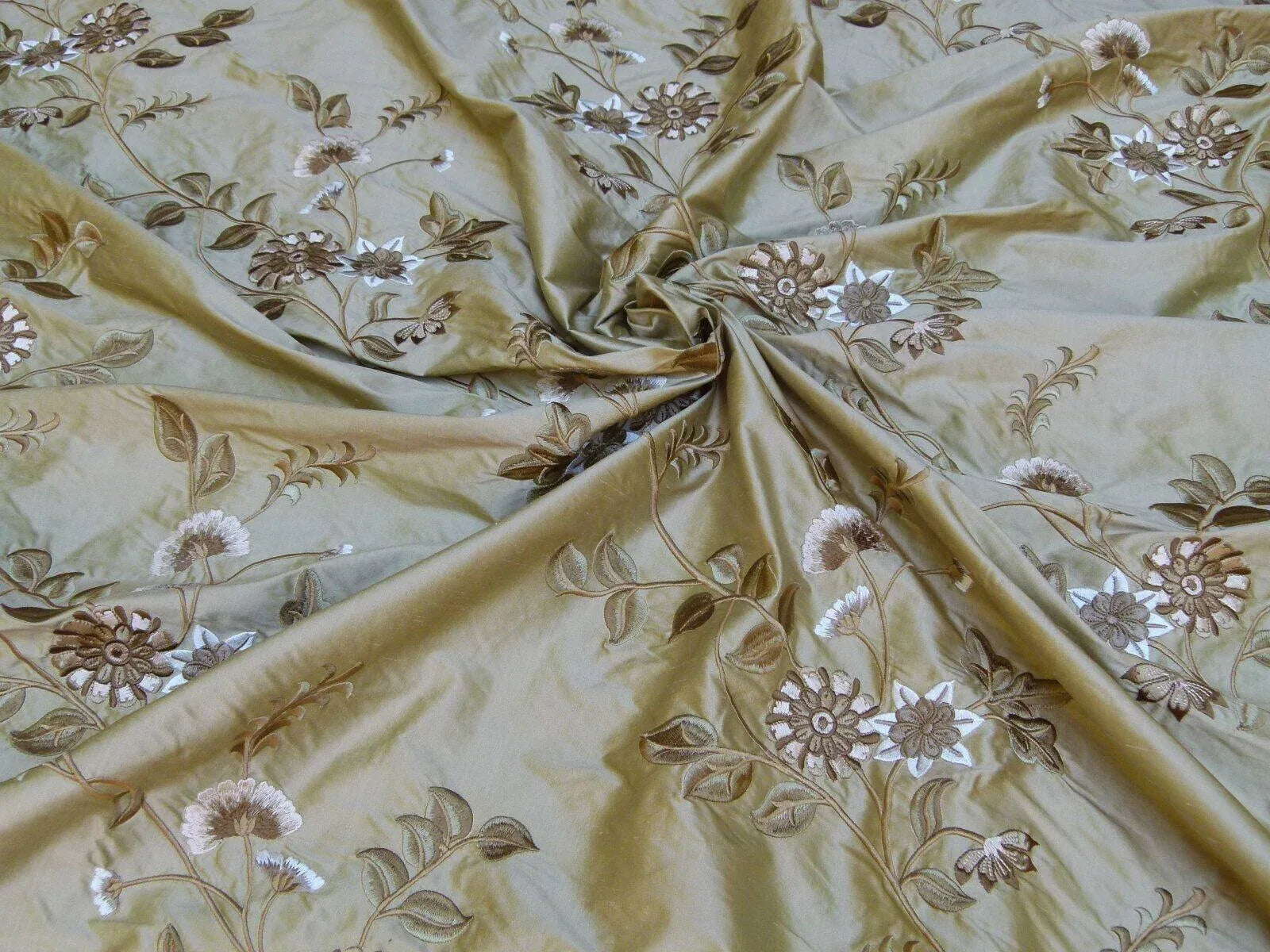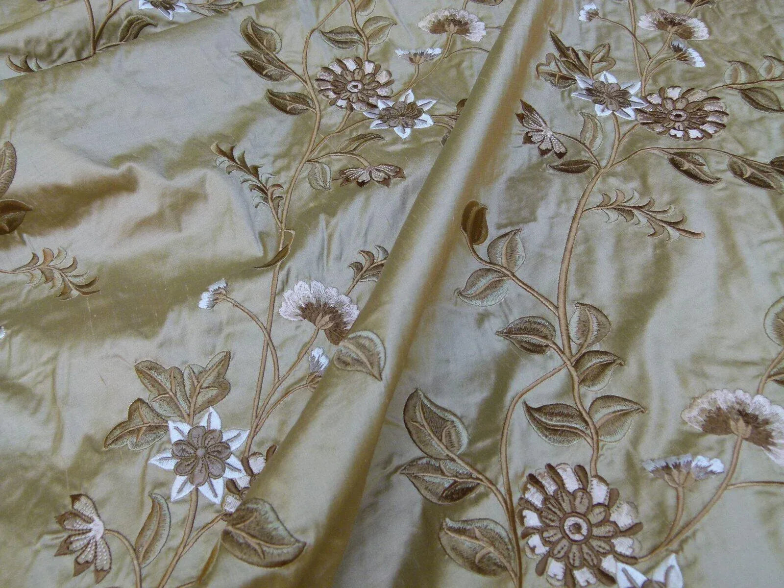 Luminous silk embroidery of highly detailed floras and vines, skillfully and artistically crafted.