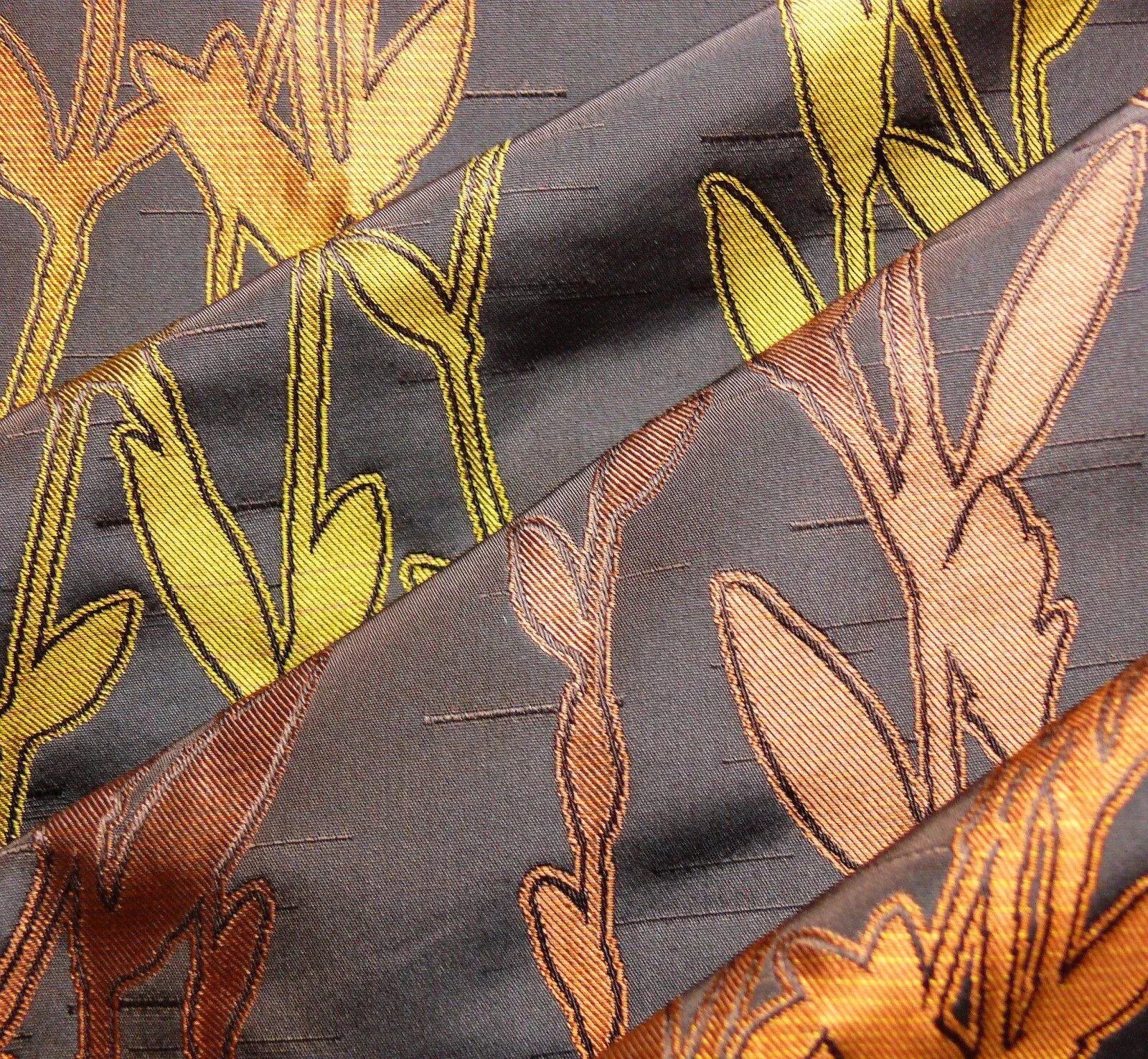 | Fabric color | 676 "Branch", Background: deep chocolate brown with a "silvery" frost. Wilow branches in yellow gold,red copper & tangerine.(Dazzling!) (Note the subtle change of shades horizontally!) |