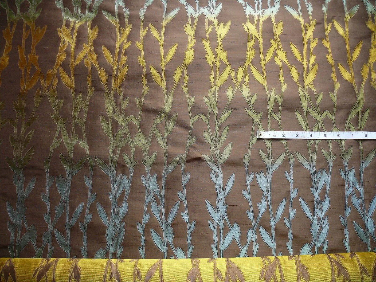 | Fabric color | 676 "Dusk", Background: dry earthy coffee. Wilow branches in bright gold yellow, aqua blue, sea-green.(A tranquil & colorful sunset!) (Note the subtle change of shades horizontally!) |