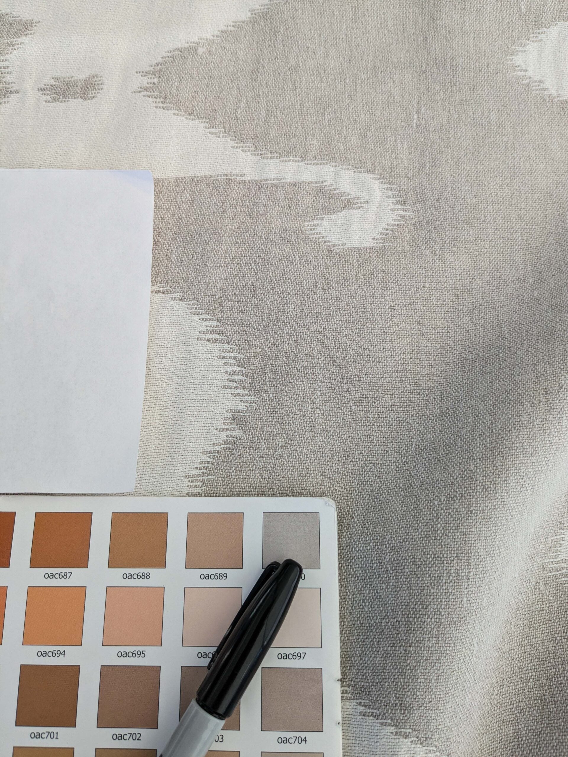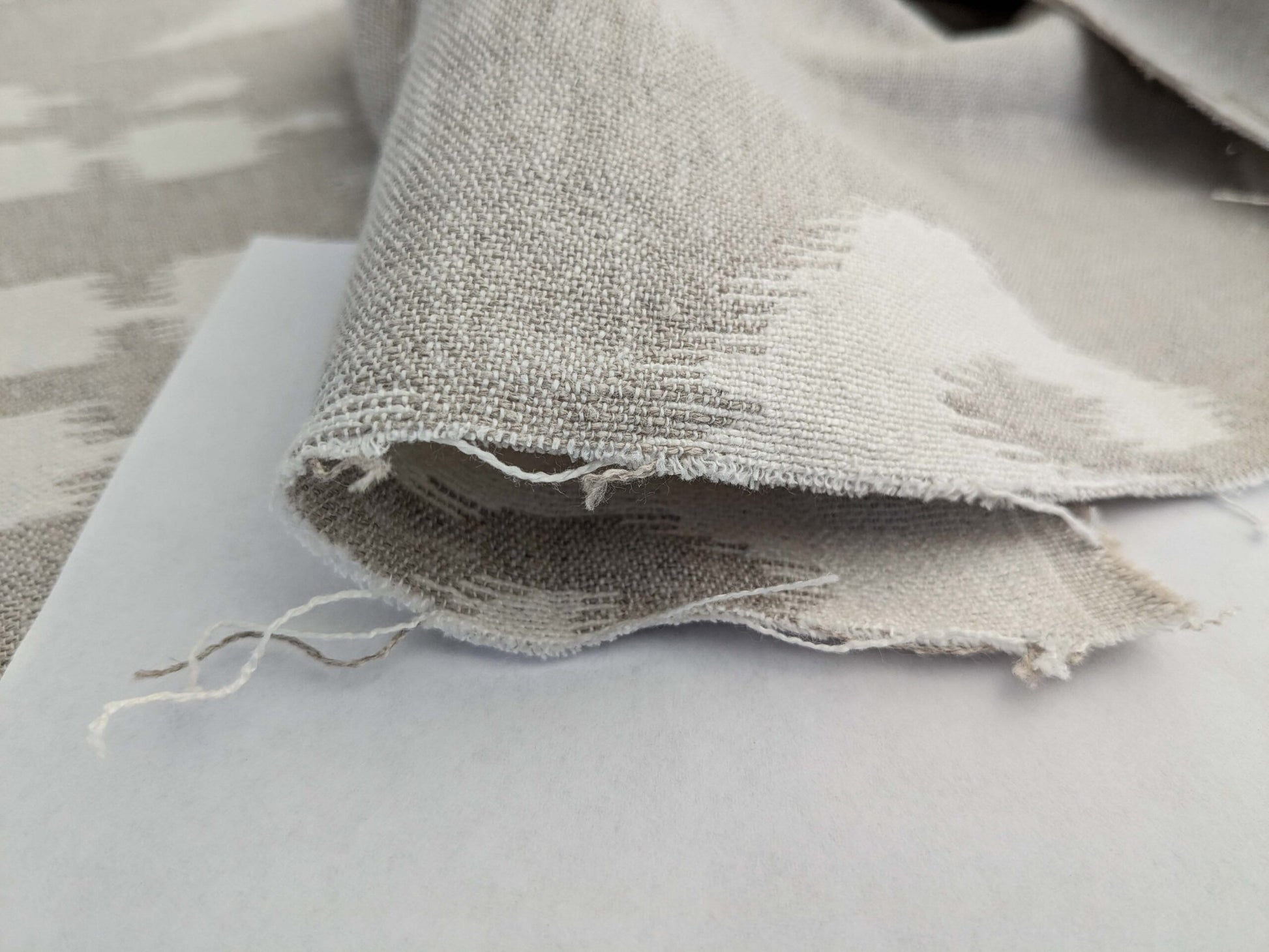 An ikat pattern in soft neutral colors. The design has a relaxed and organic feel, reminiscent of driftwood and sandy shores. This versatile fabric is perfect for creating a coastal-inspired atmosphere.