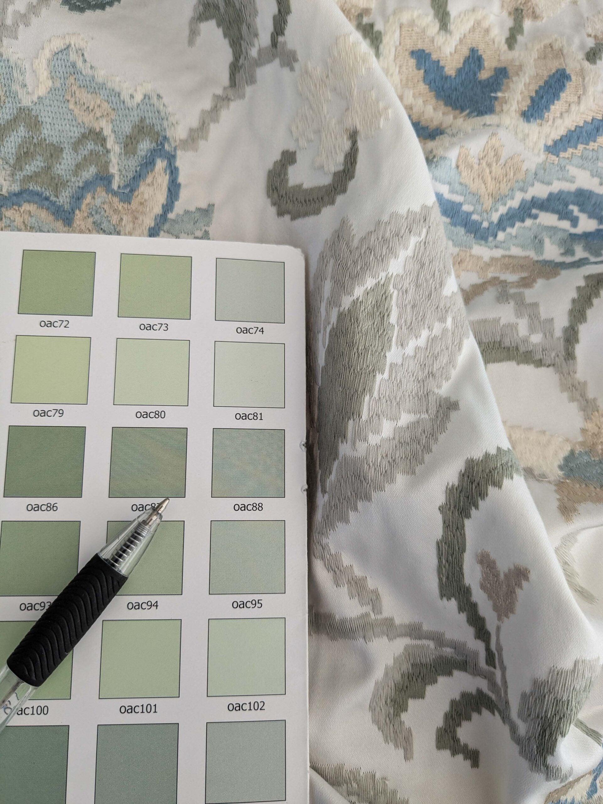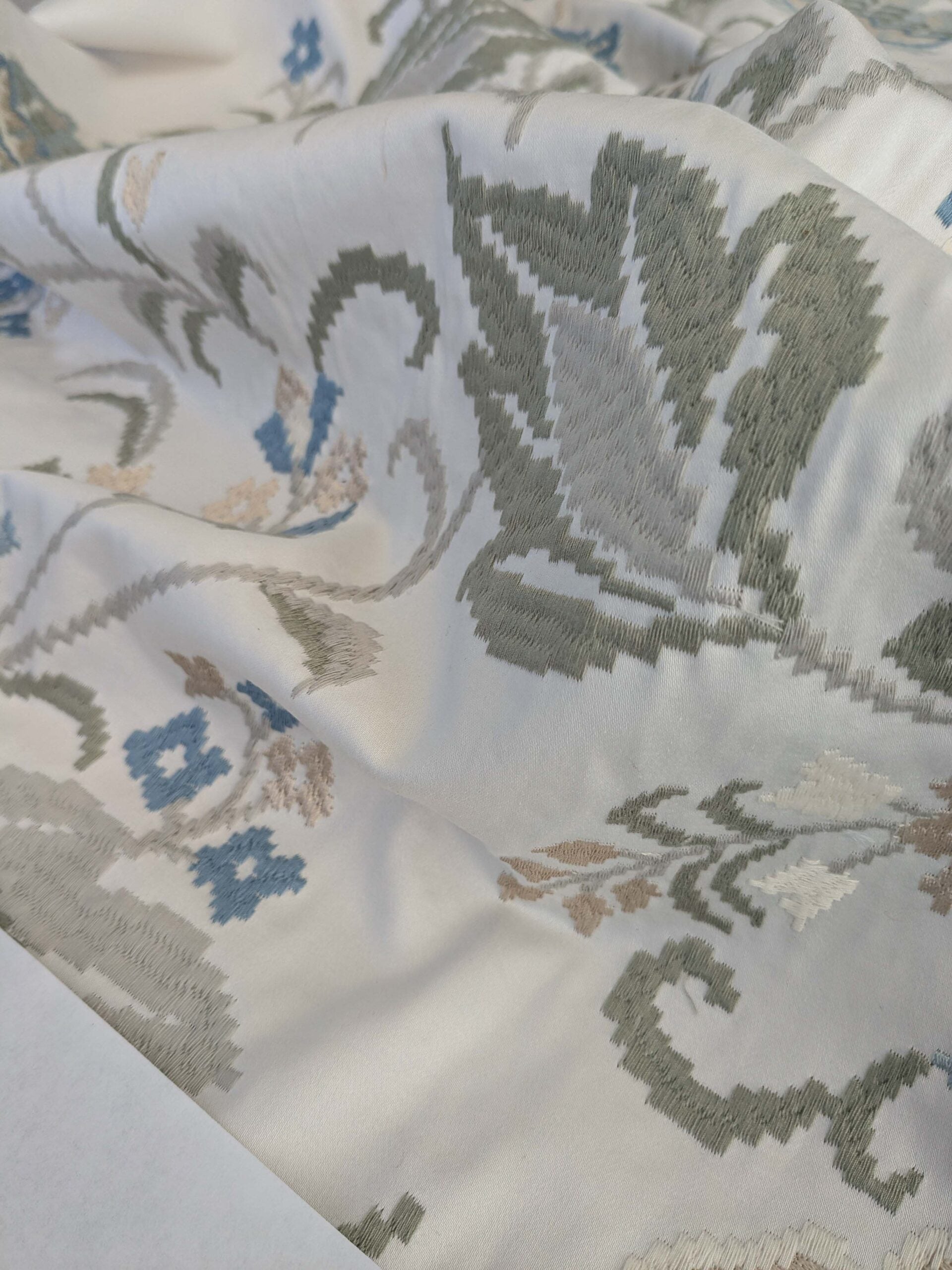 This elegant fabric features a sophisticated floral motif in shades of blue, cream, and sage green. Its intricate embroidery and delicate texture make it ideal for upholstery, curtains, or other refined decorative projects. Heavy weight with all over embroidery, this one is soft in palette but impactful in quality. Our experienced guess for the fiber content of base fabric is that it is a cotton blend.