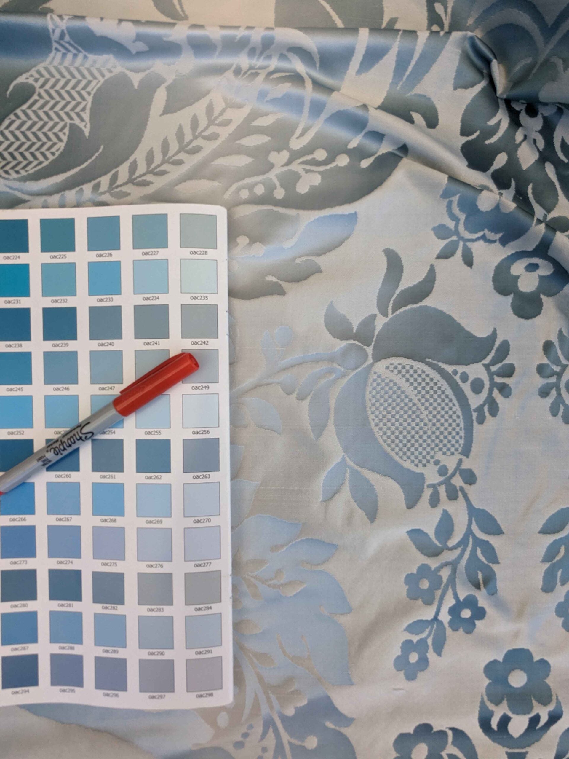 Weight: medium heavy weight silk damask. About 0.5lb/yard. Soft, yet durable enough for upholstery purpose