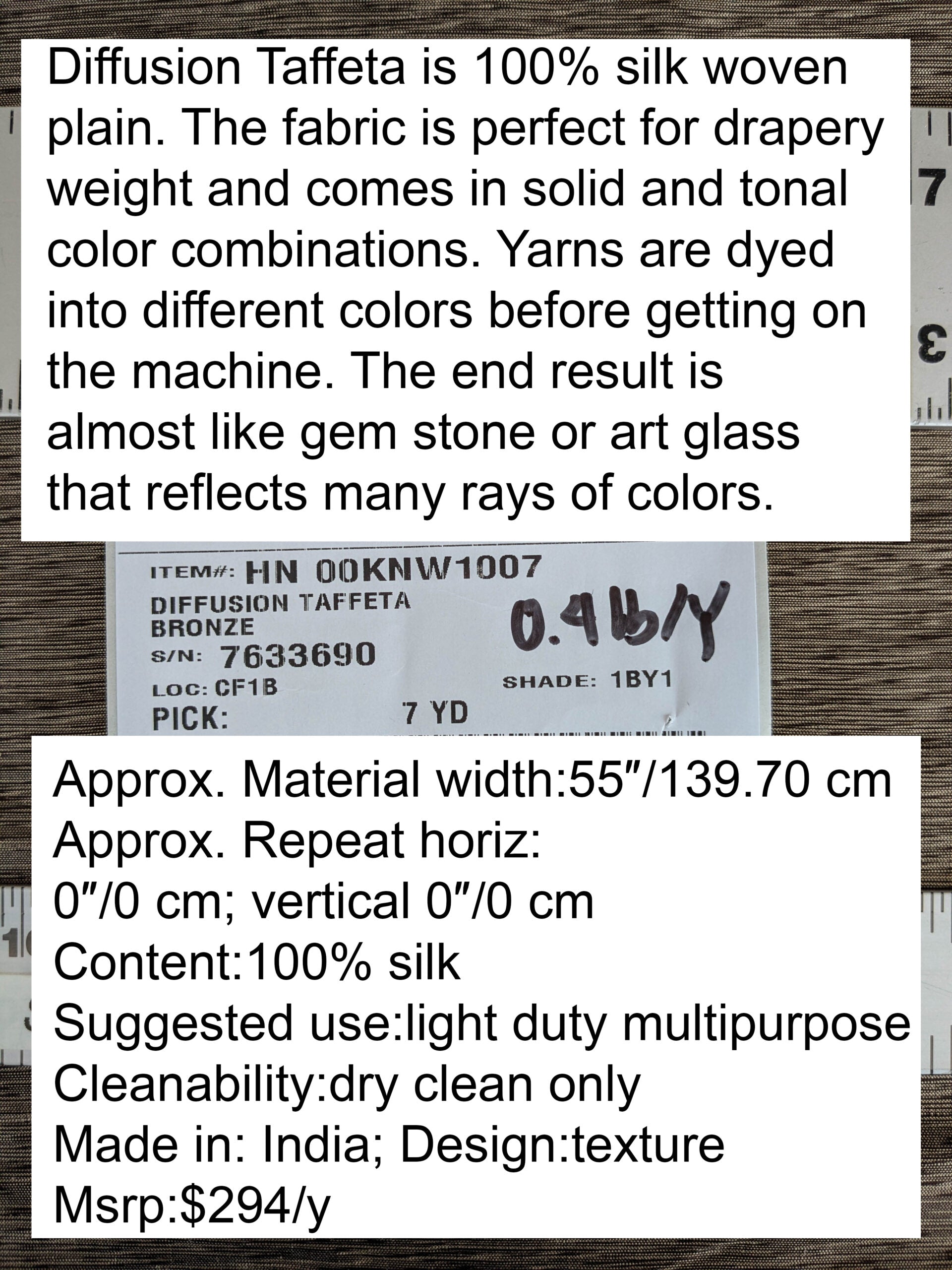 | Approx. Material width: 55″/139.70 cm Approx. Repeat horizontal: 0″/0 cm; vertical 0″/0 cm Content: 100% silk Suggested use: light duty multipurpose Cleanability: dry clean only Made in: India Design: texture Msrp: $294/y |