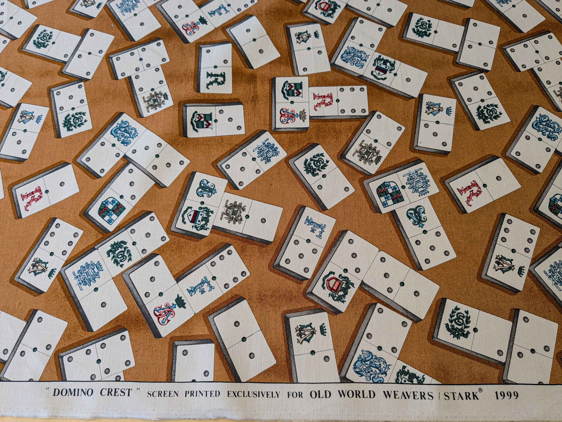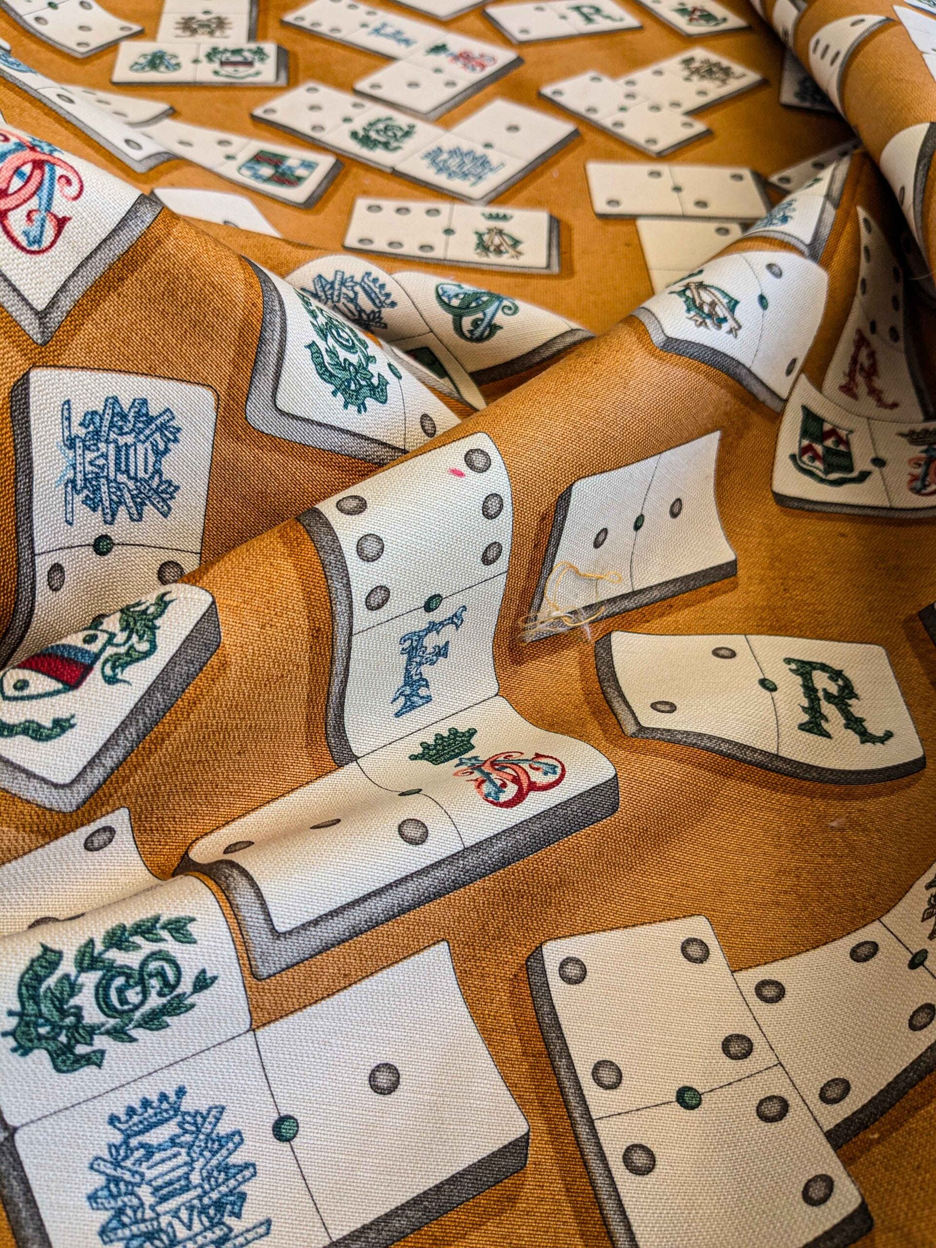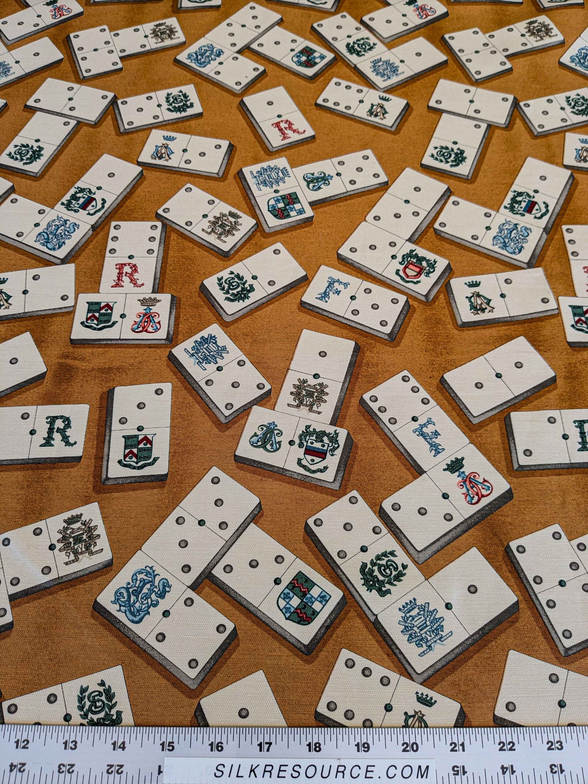 by yard Scalamandre Domino Game Crest Print Brown Mustard Gold White Art Deco Historic