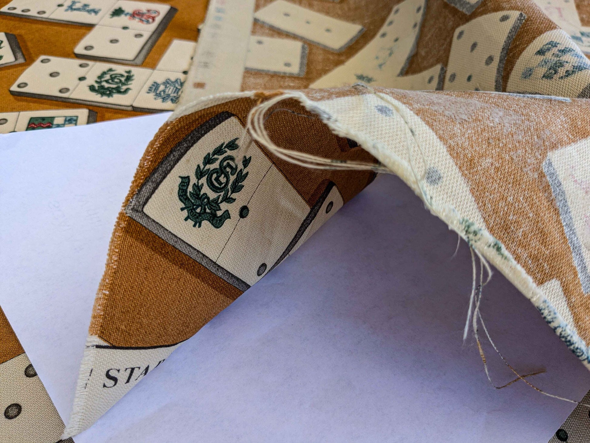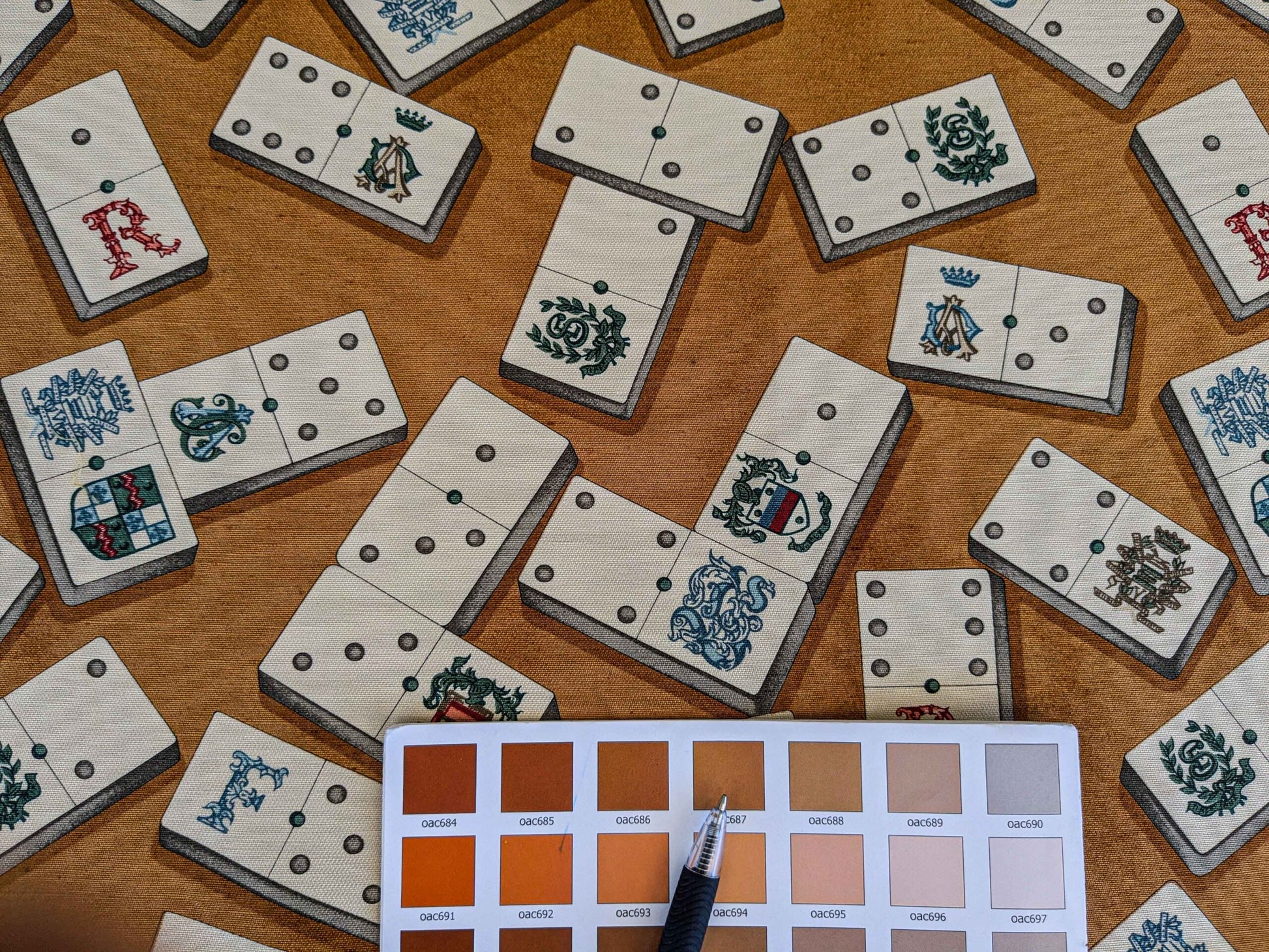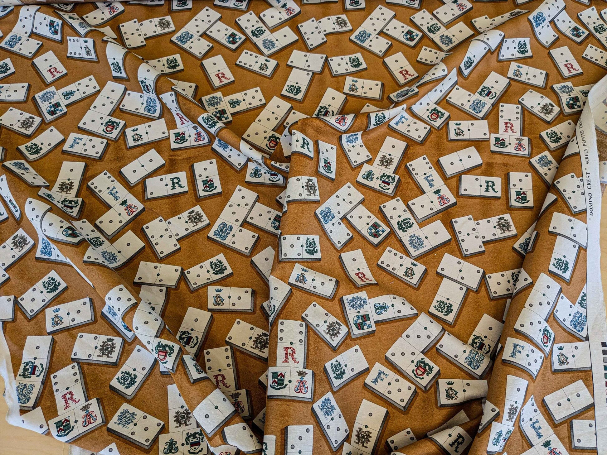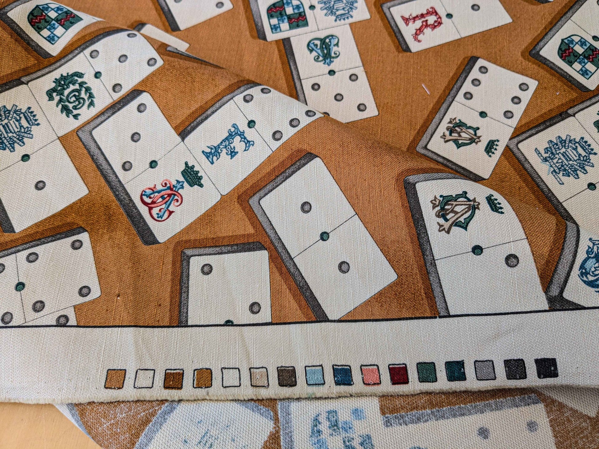 by yard Scalamandre Domino Game Crest Print Brown Mustard Gold White Art Deco Historic