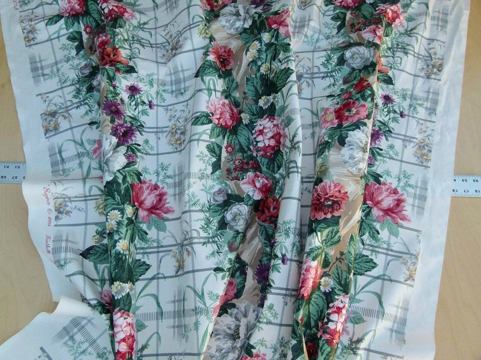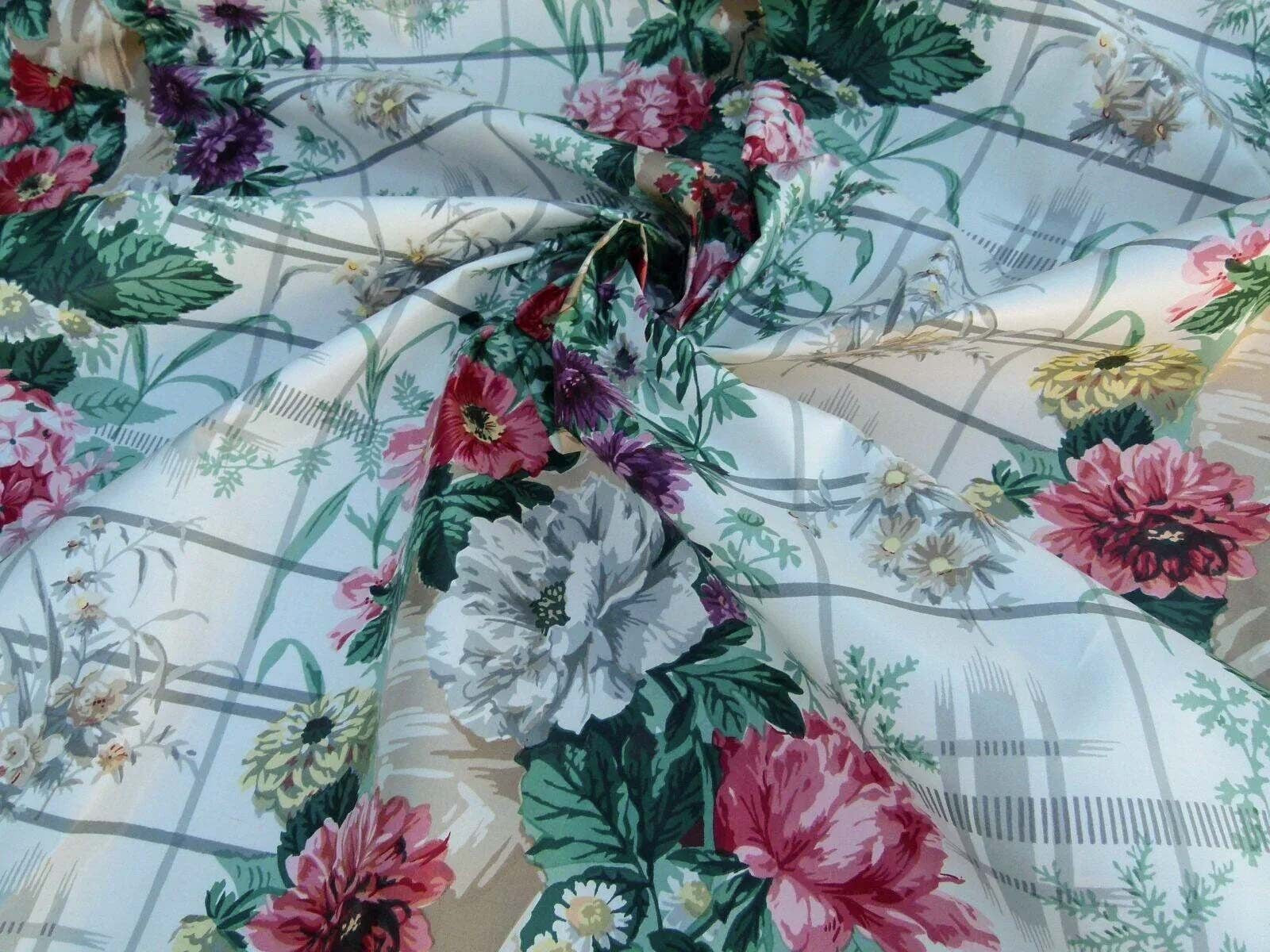 This print has so much personality! Rose garland, peonies, dahlias, daisies, geraniums, fern and grasses, adorned with silks satin sache, woven into 3 large columns. The grey "grids" can be interpreted as lattice or reflection from glasses of a green house.