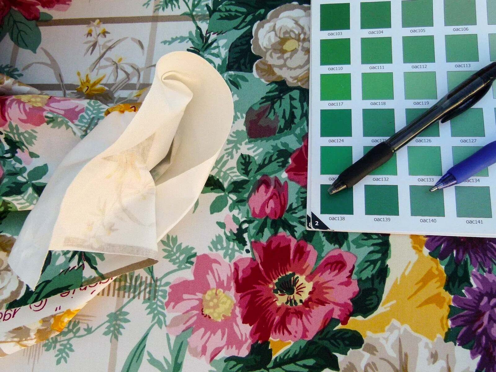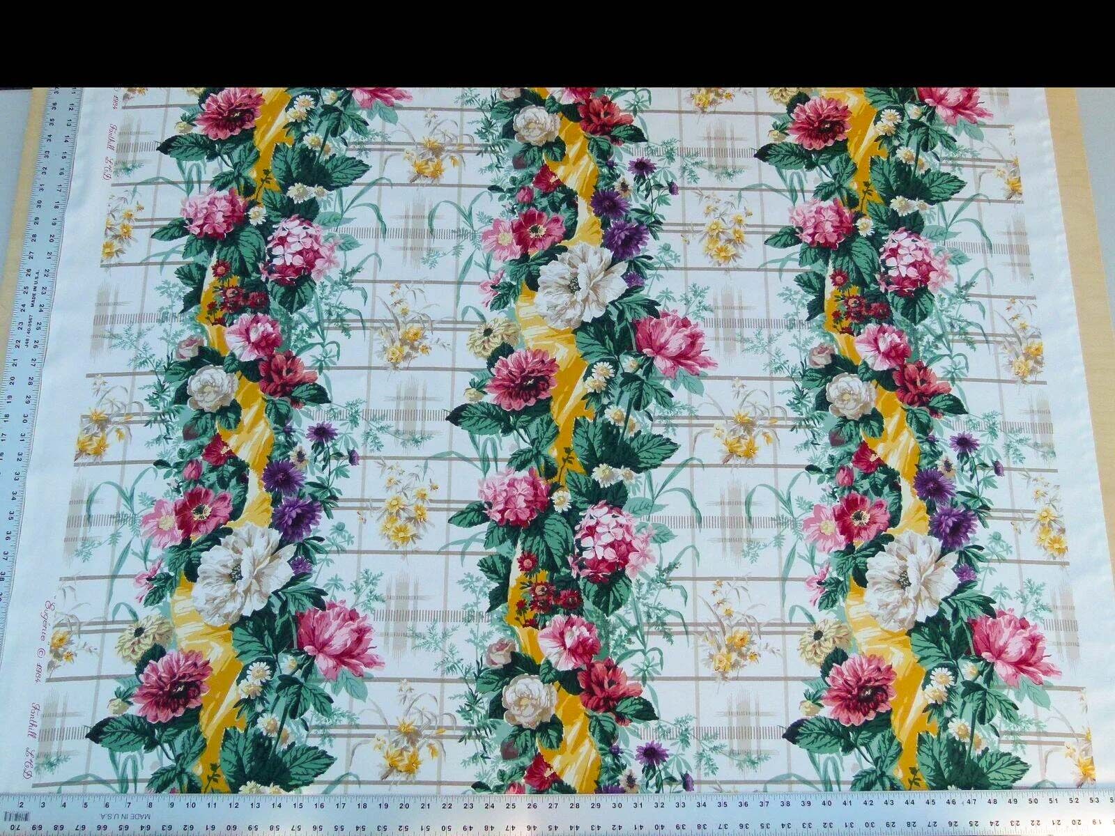 This print has so much personality! Rose garland, peonies, dahlias, daisies, geraniums, fern and grasses, adorned with silks satin sache, woven into 3 large columns. The grey "grids" can be interpreted as lattice or reflection from glasses of a green house.