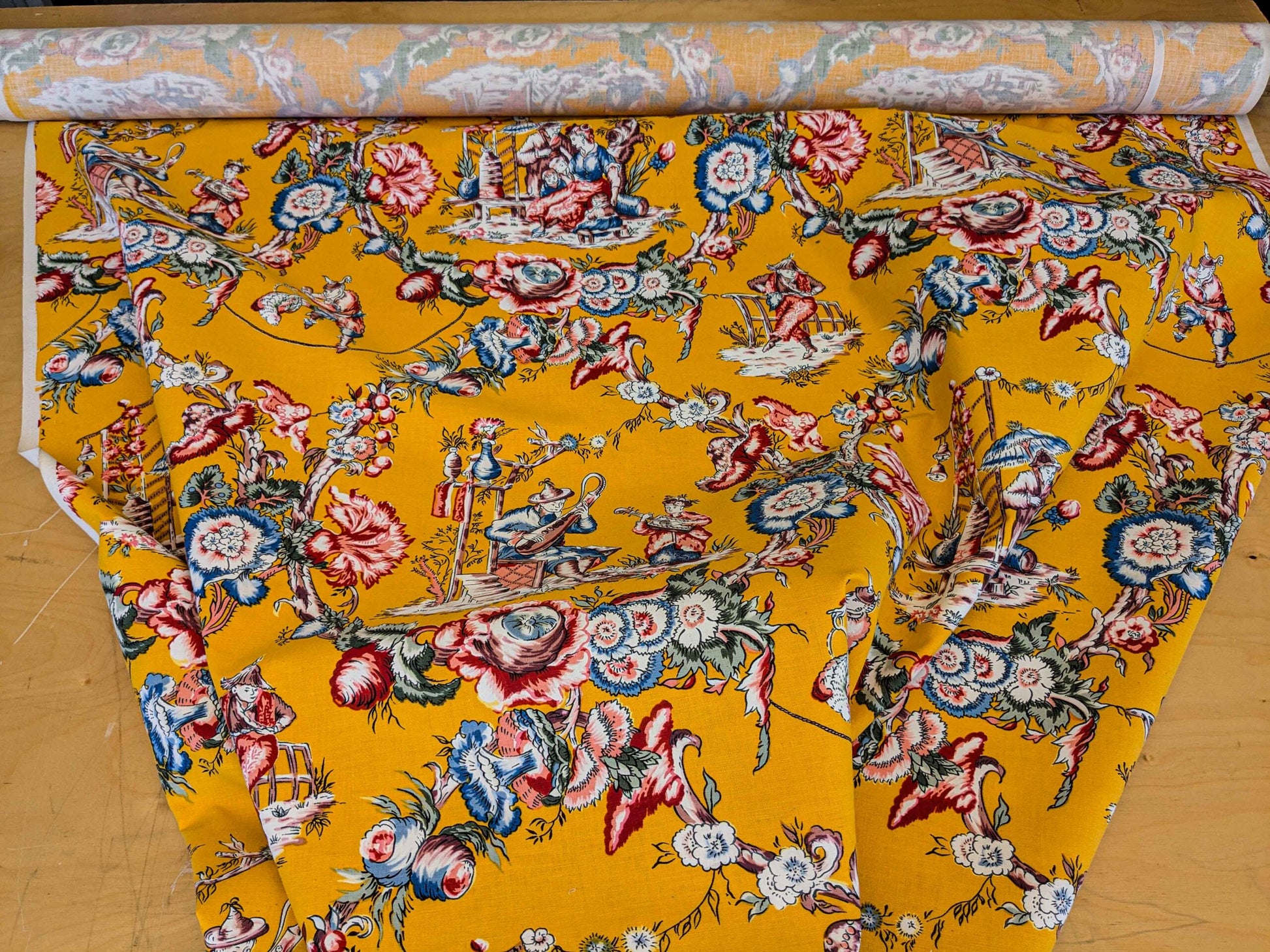 by yard Scalamandre Chinoiserie Garden Party Asian Floral Figurative Red Blue on Yellow Cotton