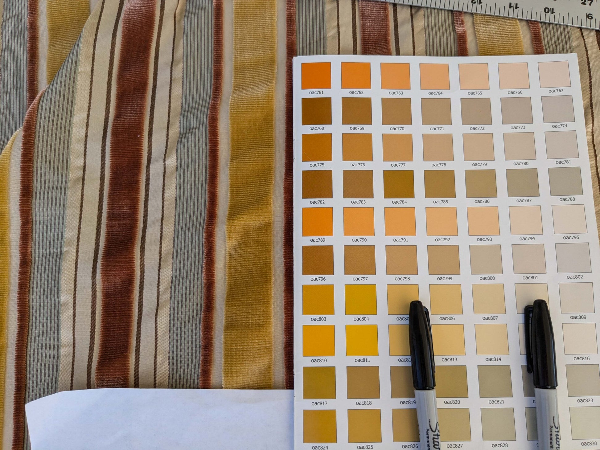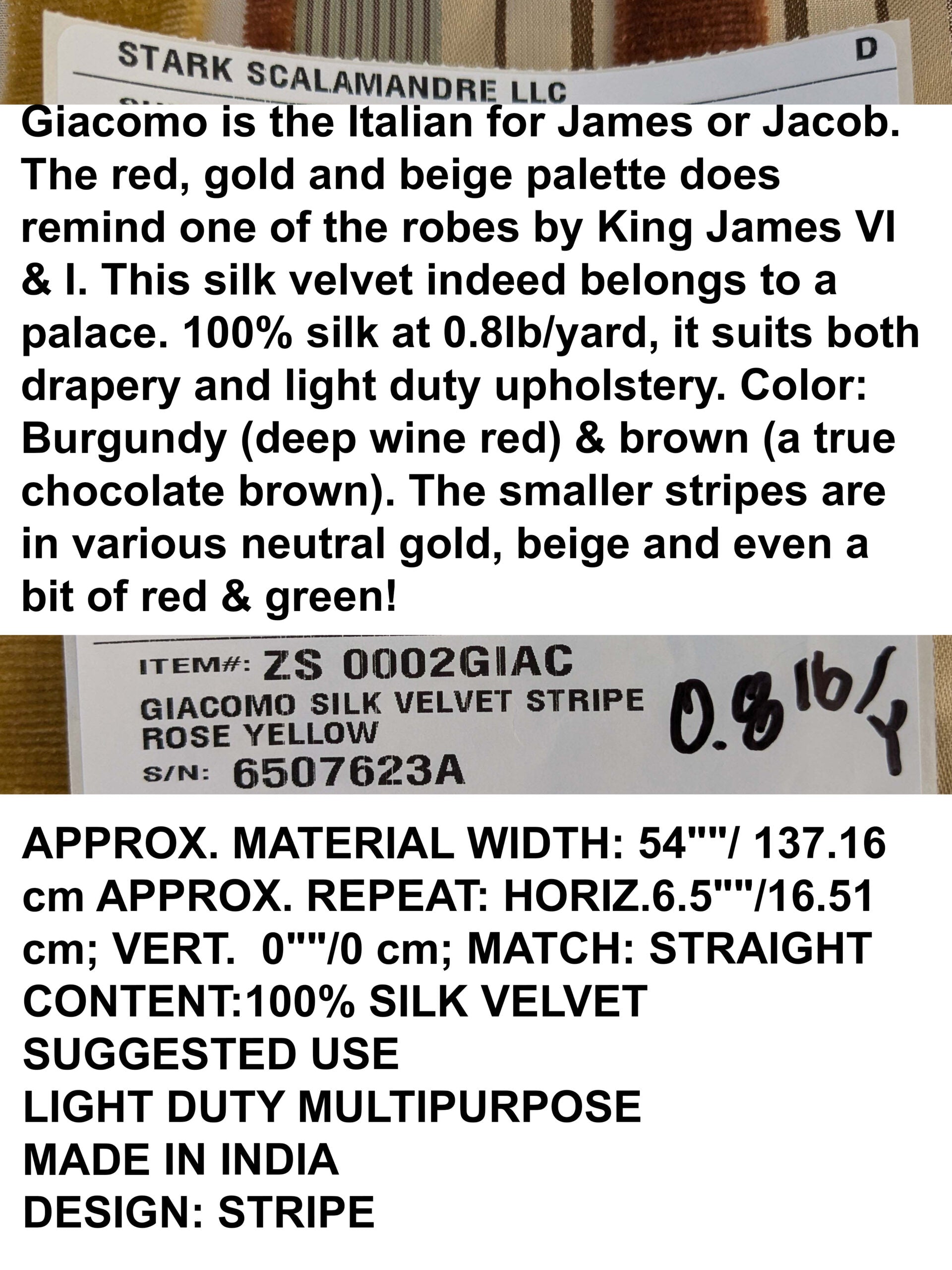 | Giacomo is the Italian for James or Jacob. The red, gold and beige palette does remind one of the robes by King James VI & I. This silk velvet indeed belongs to a palace. 100% silk at 0.8lb/yard, it suits both drapery and light duty upholstery. Color: Rose and yellow. The rose is an almost fruity deep pink-red; the yellow is a warm gold. The smaller stripes are in various neutral gold, beige and even a bit of coffee brown. |