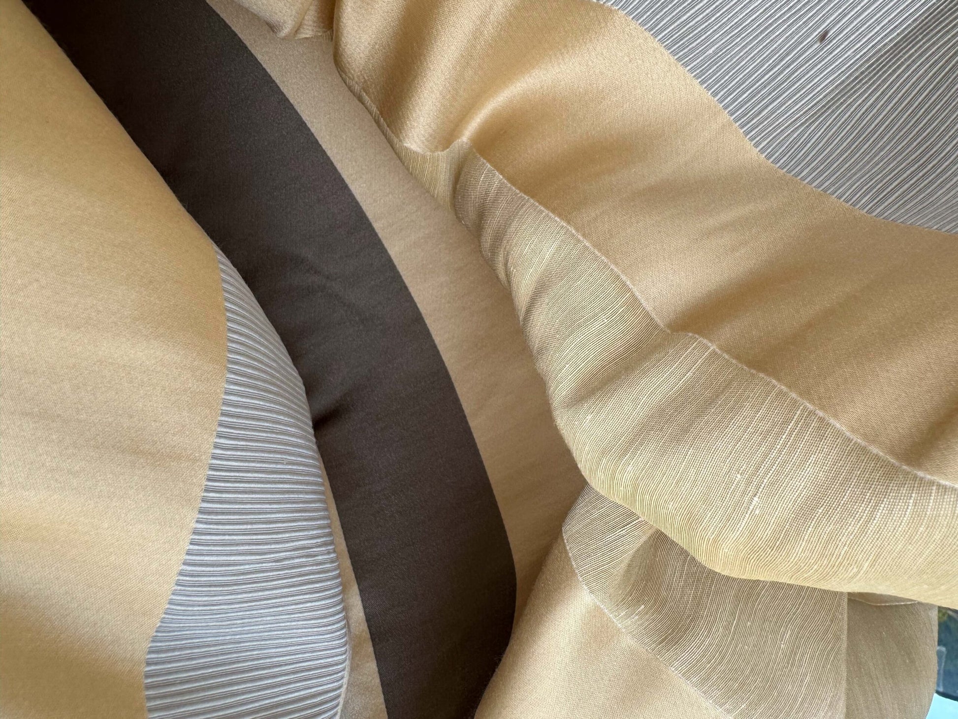 There are three kinds of texture in the weave, satin, matte and ribbed. Each texture then takes on a different color. The end creation is a high iridescent and interesting combination of different fiber, different texture and different colors.