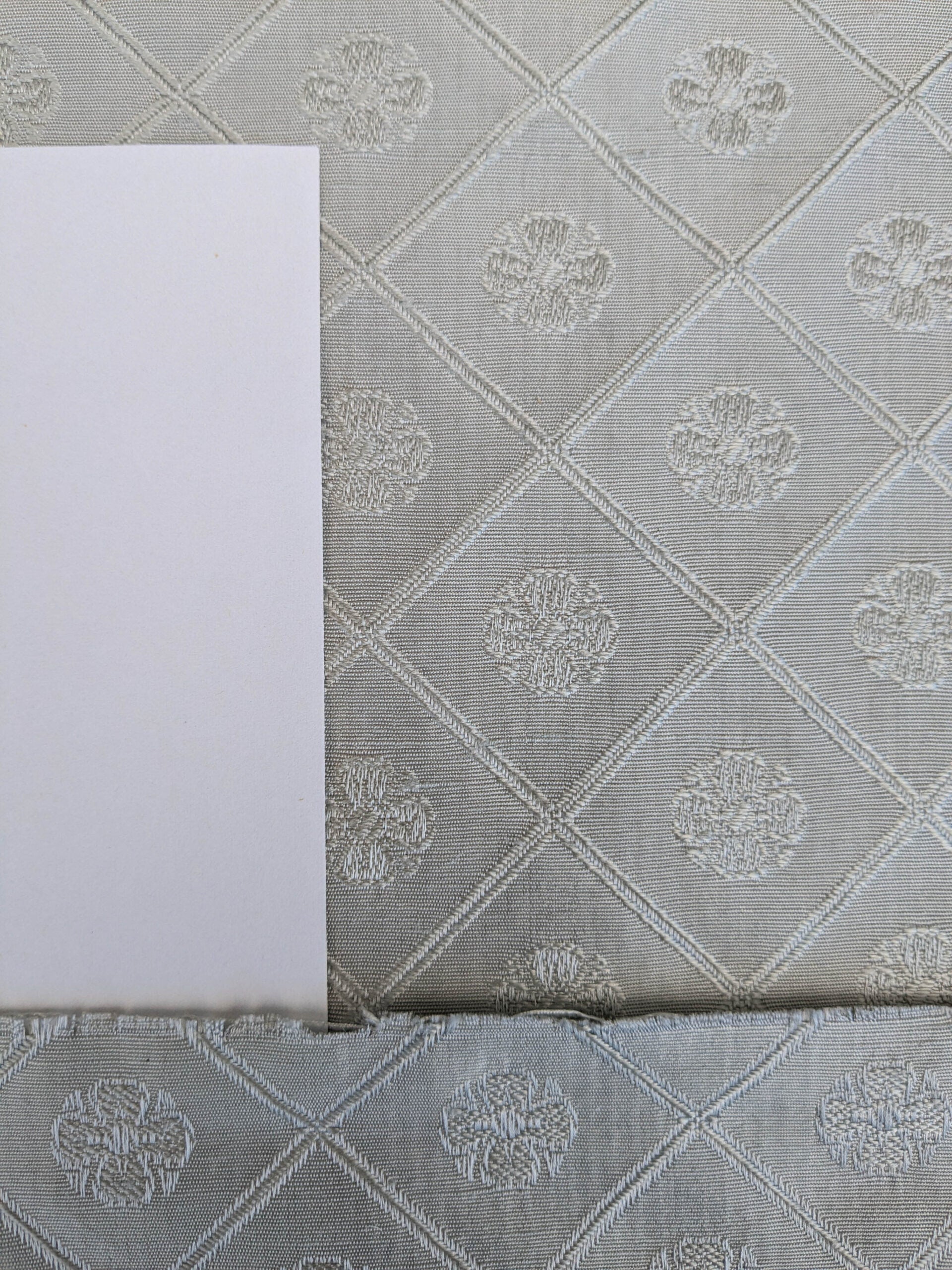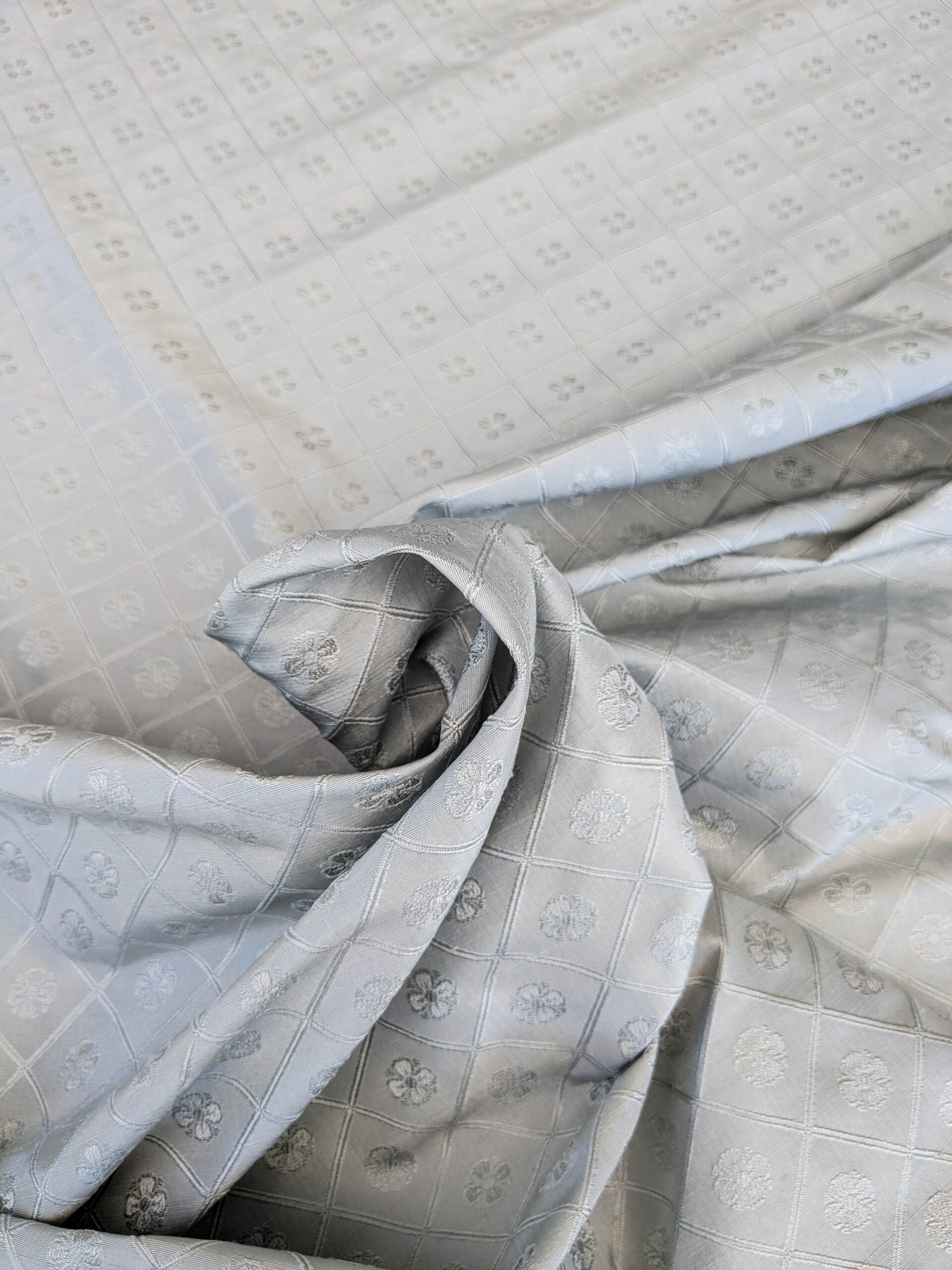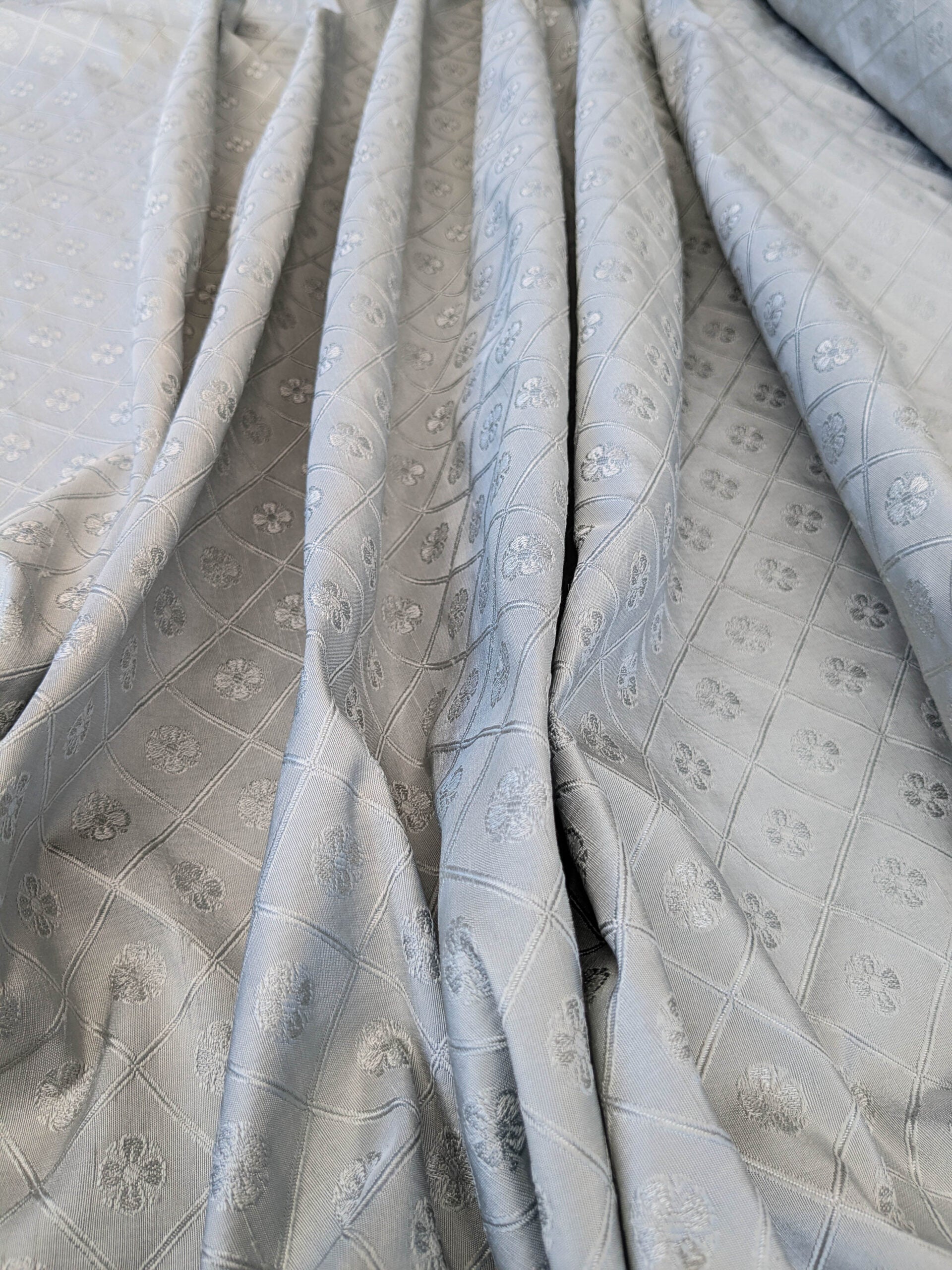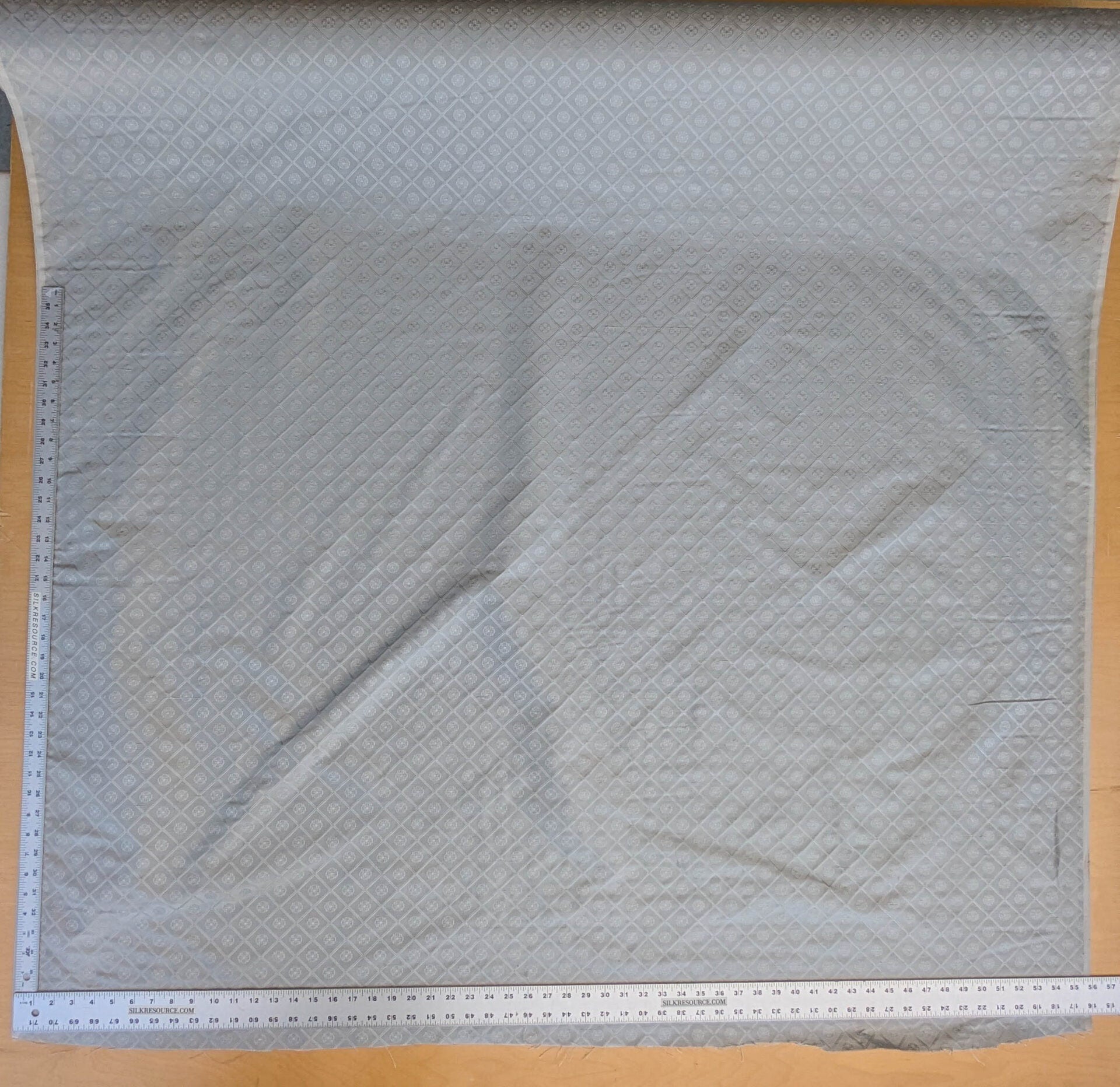 | Como silk is woven in Italy by Grey and Watkins. Its sleek, simple yet luxurious quality comes from centuries of tradition in Lake Como region. Lattice design, in a smaller scale, has four-leaf clover or crest in the middle. Seafog is a demure, cool and silvery hue. Iridescent and lush, this silk can work for almost any project. This will be serene for a bedroom! |