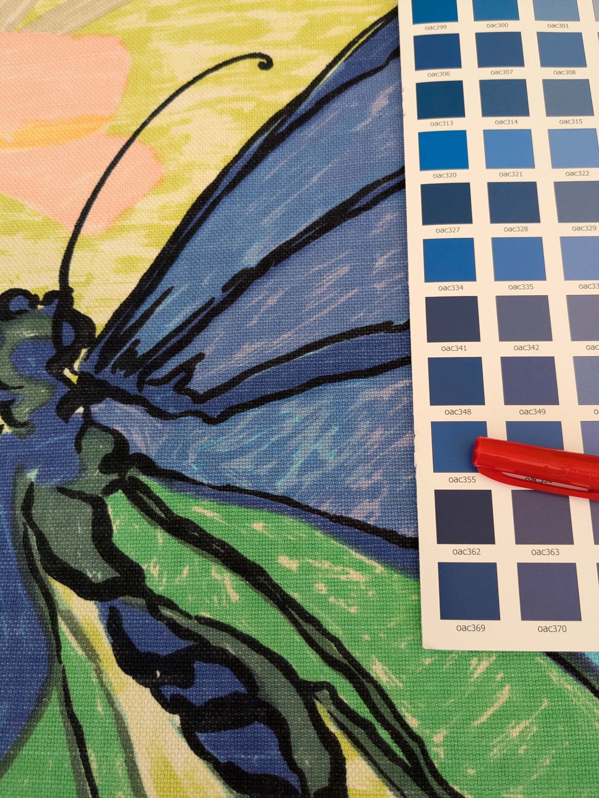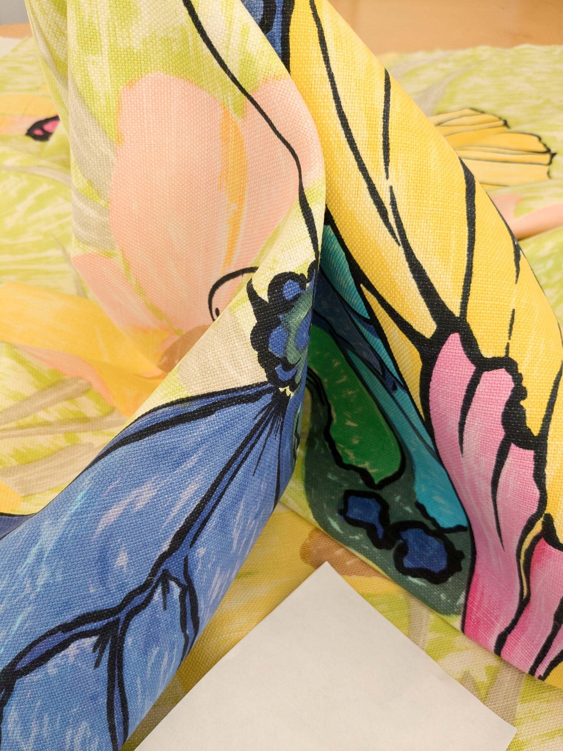A stunning textile that combines bold design with natural elegance. It features two oversized butterflies as the centerpiece of its print, one in vibrant blue with teal, green, pink, and yellow accents, and the other in soft yellow with striking pink highlights. These detailed butterflies are set against a textured green background with a hand-drawn, abstract feel, adorned with delicate floral motifs in pastel yellow and pink, accented by muted brown centers. The linen material enhances the fabric’s luxurious feel, making it an excellent choice for upholstery, drapery, or decorative projects. With its vivid colors and intricate patterns, this fabric brings a lively, whimsical, and sophisticated touch to any interior space.