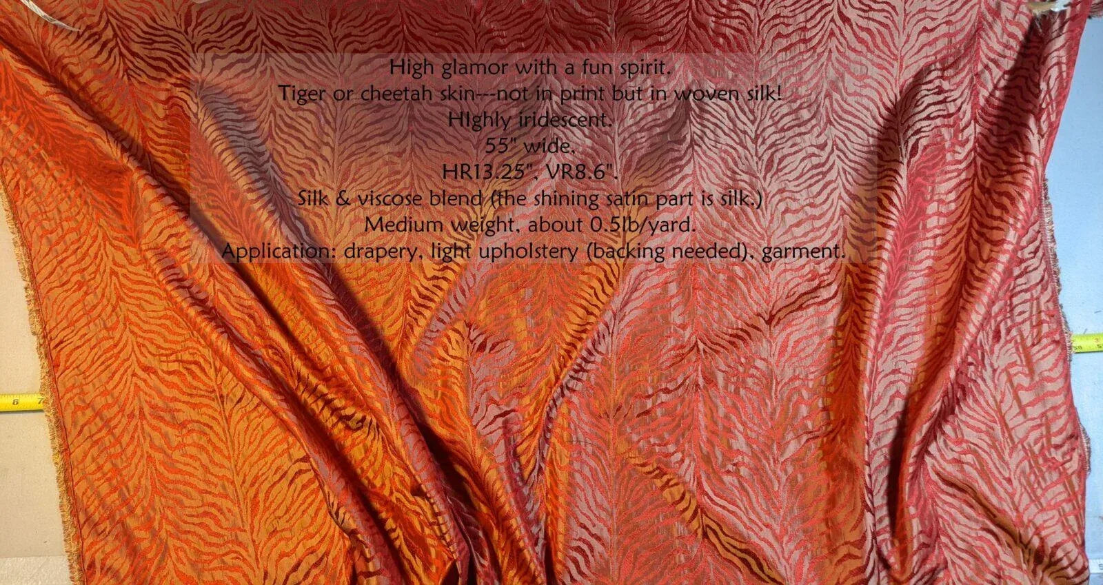High glamor with a fun spirit. Tiger or cheetah skin---not in print but in woven silk! Highly iridescent. 55" wide, HR13.25", VR8.6". Silk & viscose blend (the shining satin part is silk.) Medium weight, about 0.5lb/yard. Application: drapery, light upholstery (backing needed), garment.