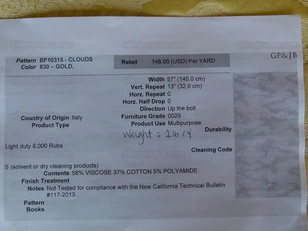Durability: official data is "Light duty 8,000 Rubs", but actual fabric feels like medium duty and suitable for upholstery!)Heavy, about 1lb per yard!
