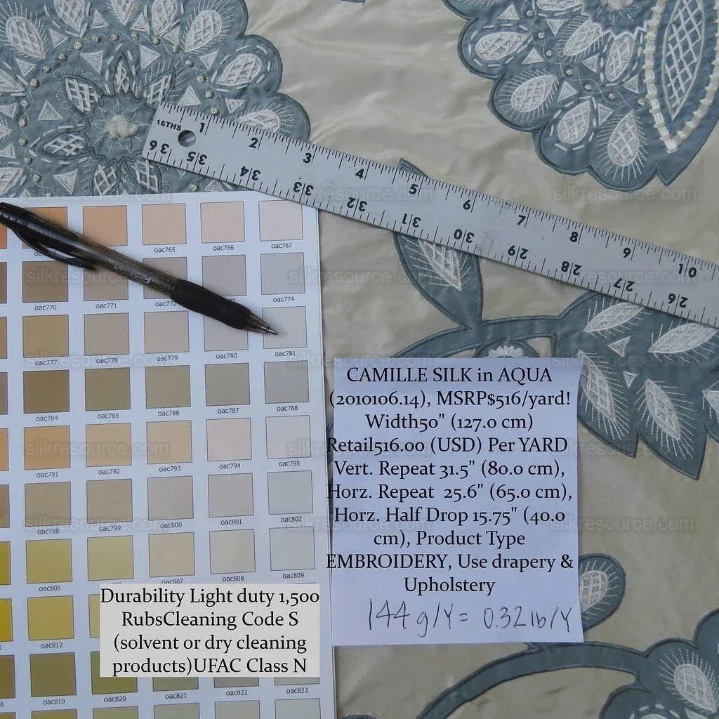 By Yd Lee Jofa Camille Silk Aqua Embroidery On Cream Blue Large Camellia Flora MSRP USD 516/Y