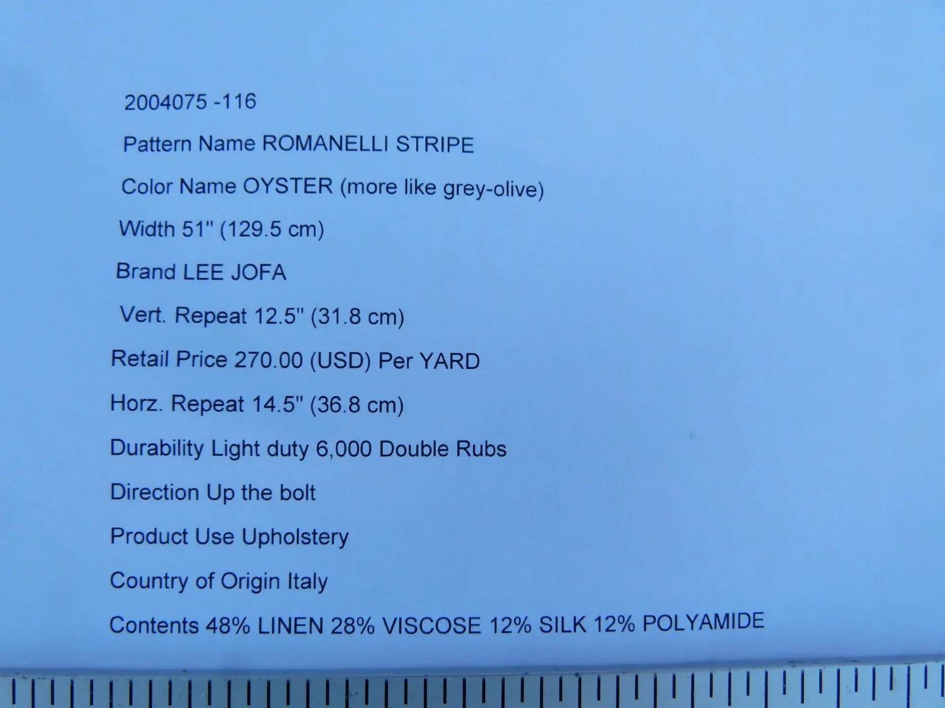 All details (pattern name, colorway, content, repeat, width, durability, retail price, country of origin): Please see text in photo.