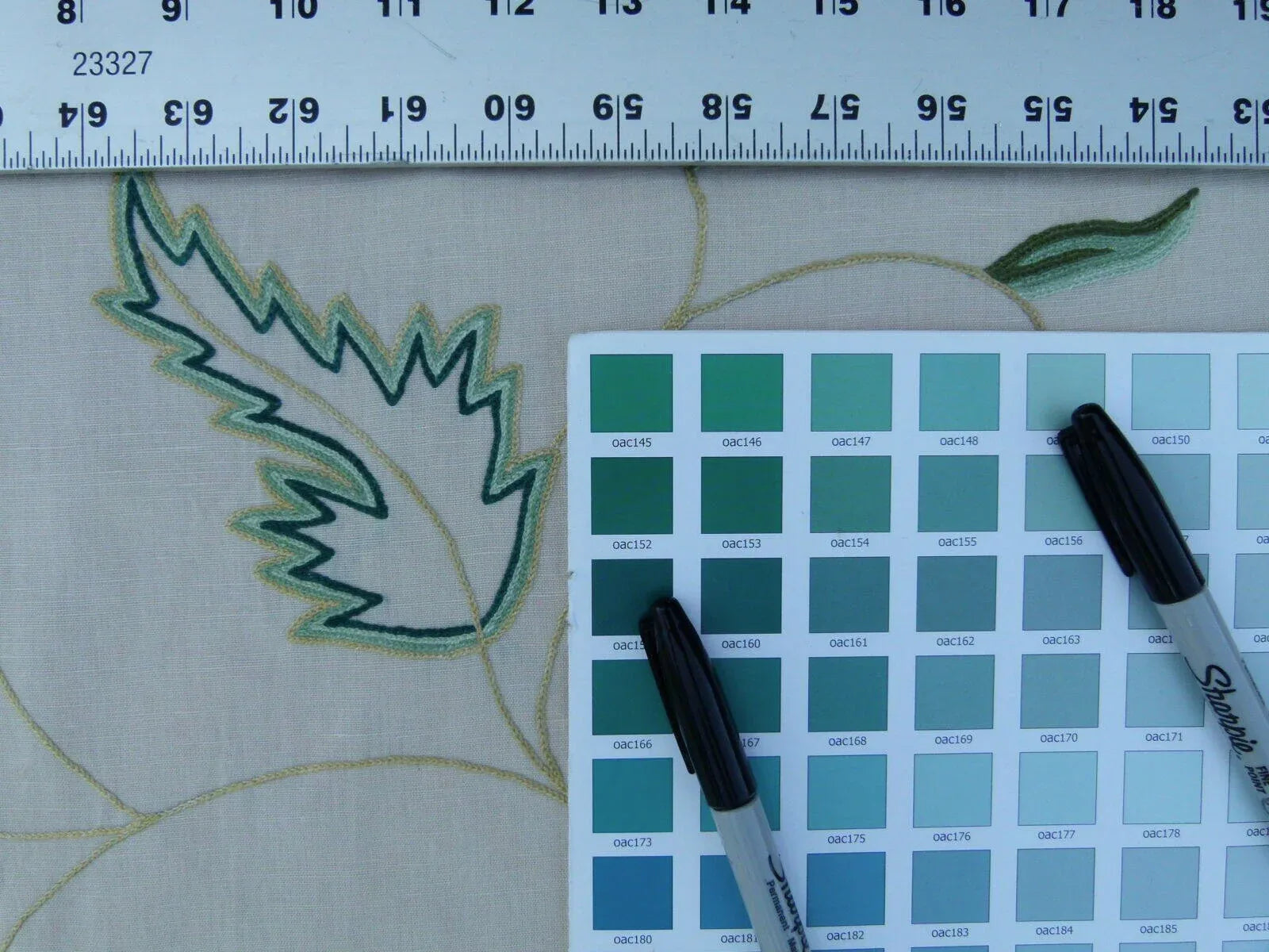 By Yd Lee Jofa Three Oaks Crewel Embroidery Red Green Flower Natural Linen Cotton Hand Made MSRP USD 296/Y
