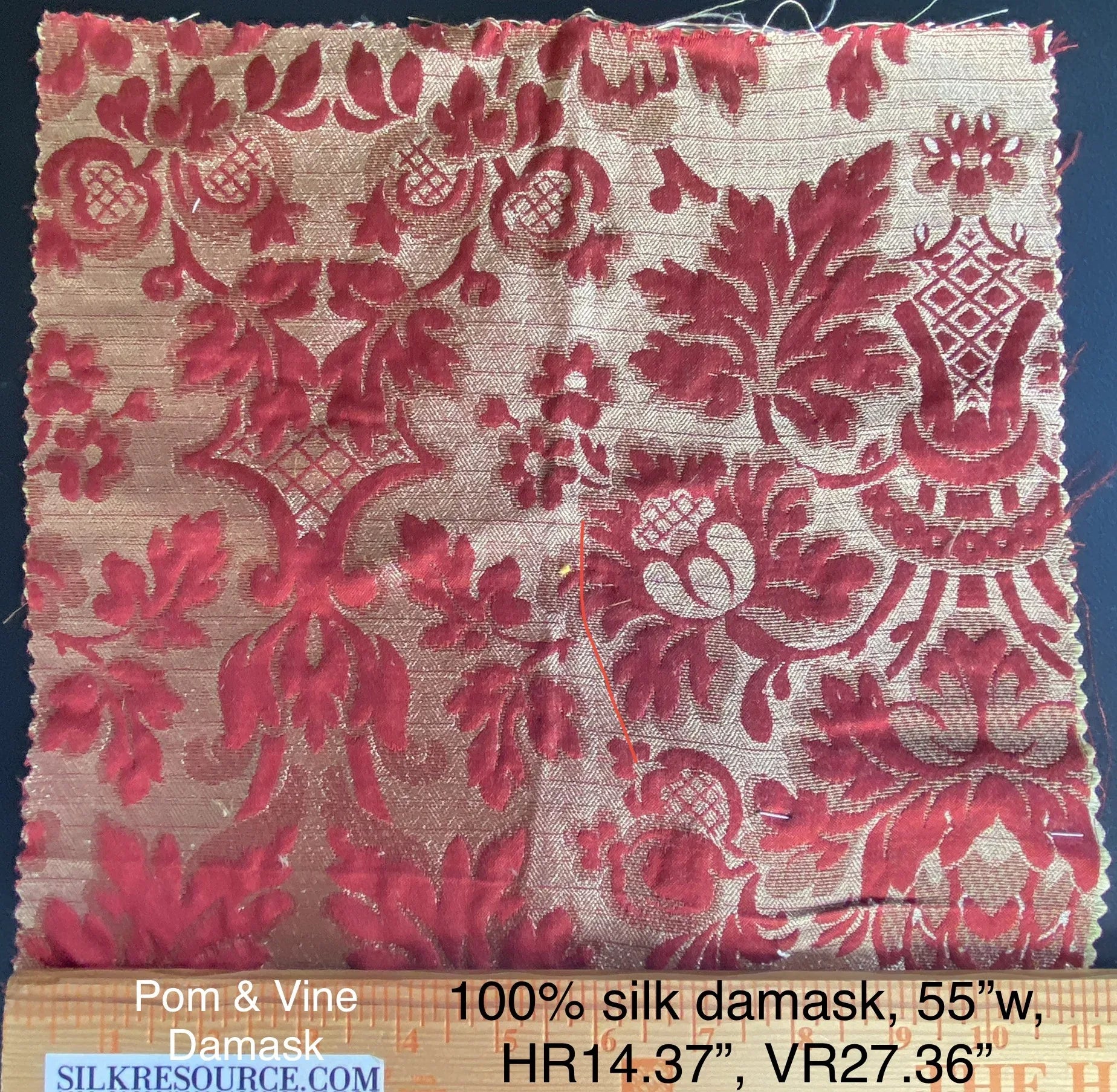 Traditional Renaissance silk mantelasse. grape vines, roses, pomegranate woven onto a textured background. Soft and slightly puffed, this silk is a perfect combination of both fineness and earthy touch.