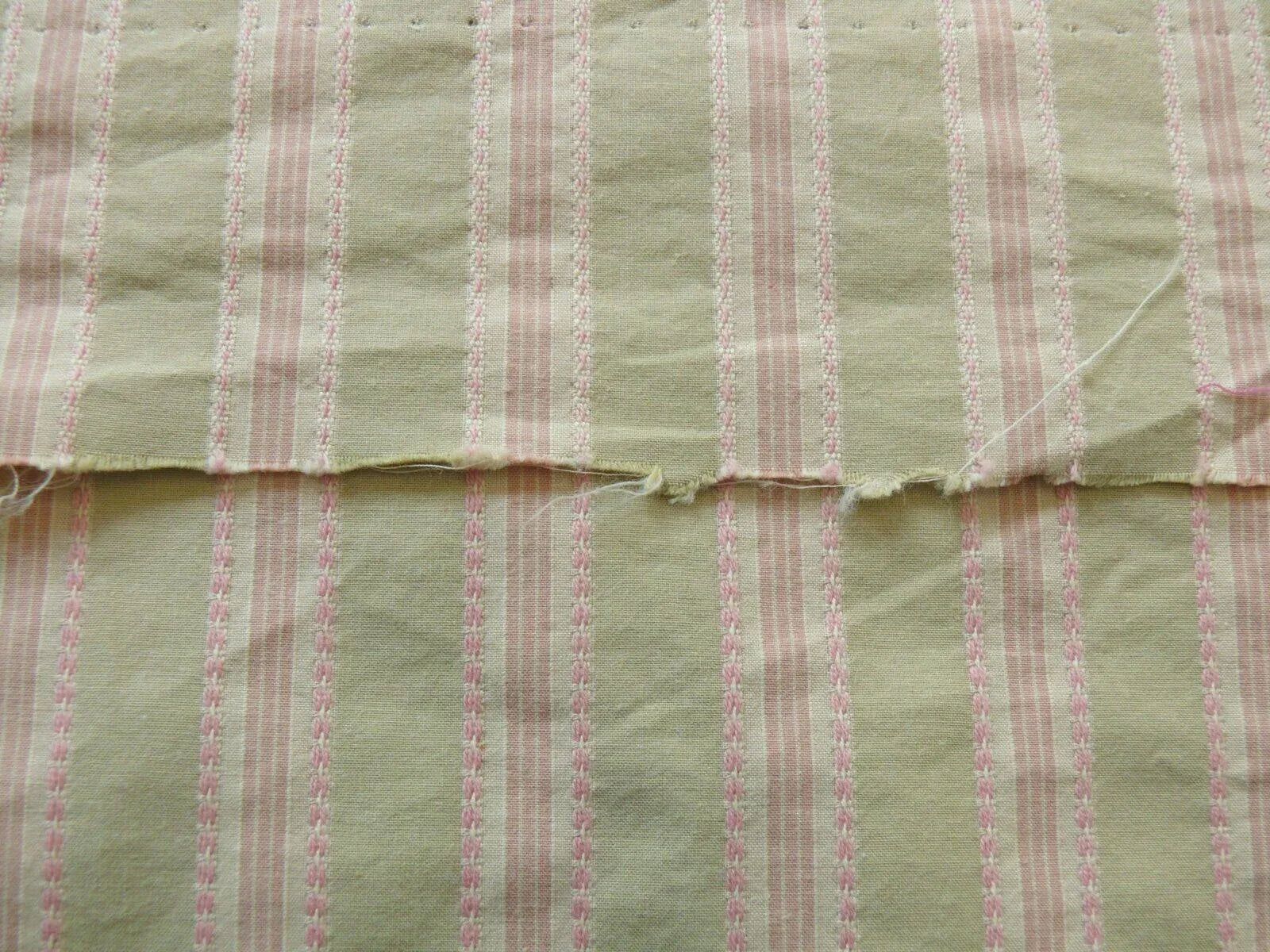Price is per yard Total yards available: 24.5 yards Although we do not know the brand, this woven stripe has lots of designer details. Softly subtle stripe in 100% cotton. Has a slightly raised texture woven into the pattern. Color: soft spring green; muted pink; white. Note the colors are muted & subtle. Gorgeous for drapery, bedding, garment, slipcover. If used for upholstery, it has to be light duty (furniture is rarely used.)