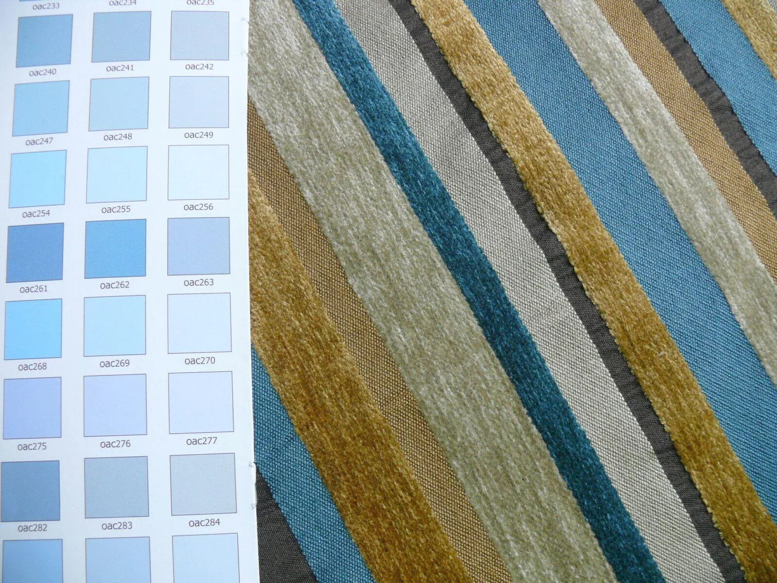 Designer exclusive chenille. High quality. Heavy and thick. Silky sheen. Cotton, viscose & polyester blend. Note the stripe runs horizontally.