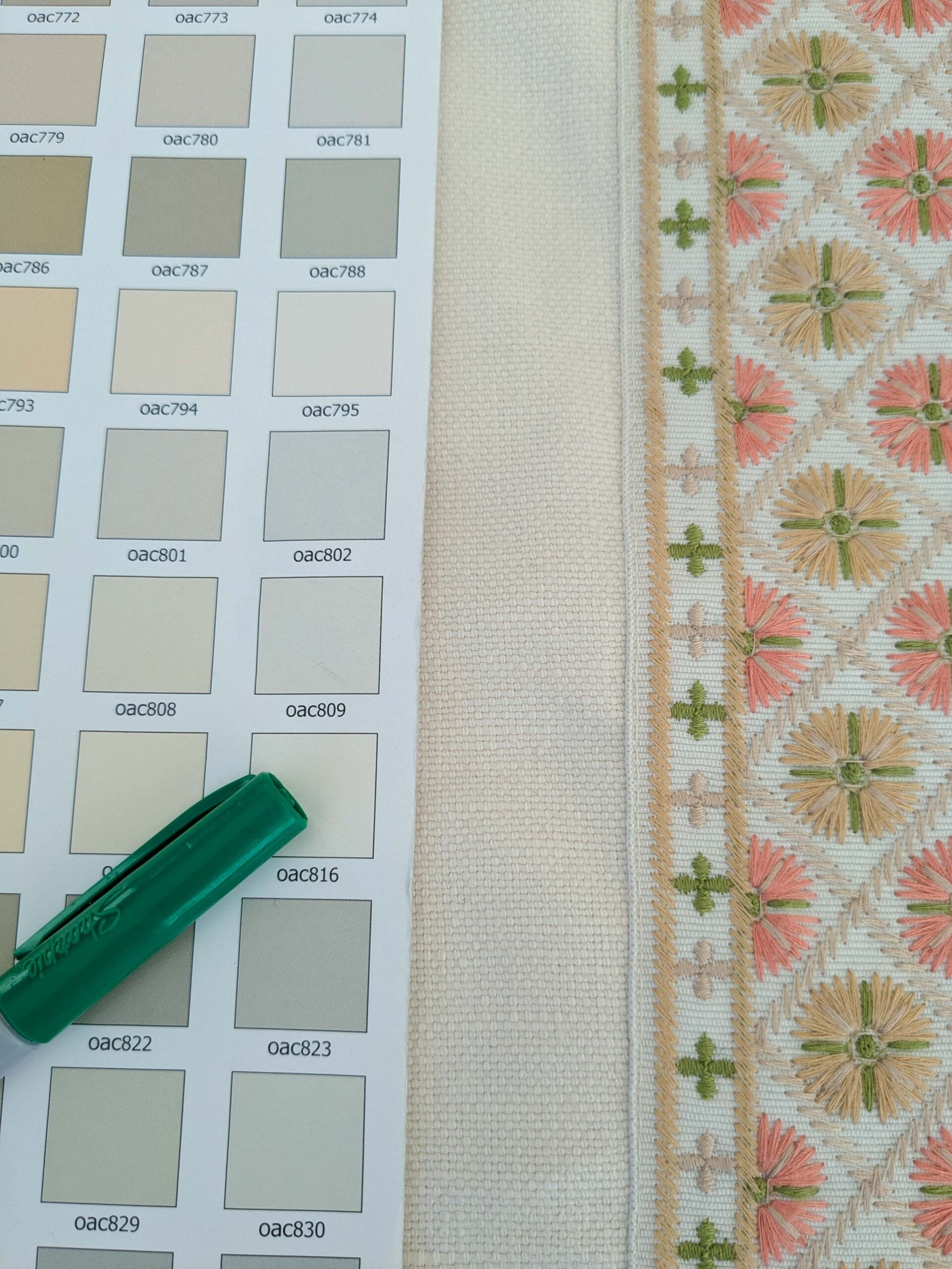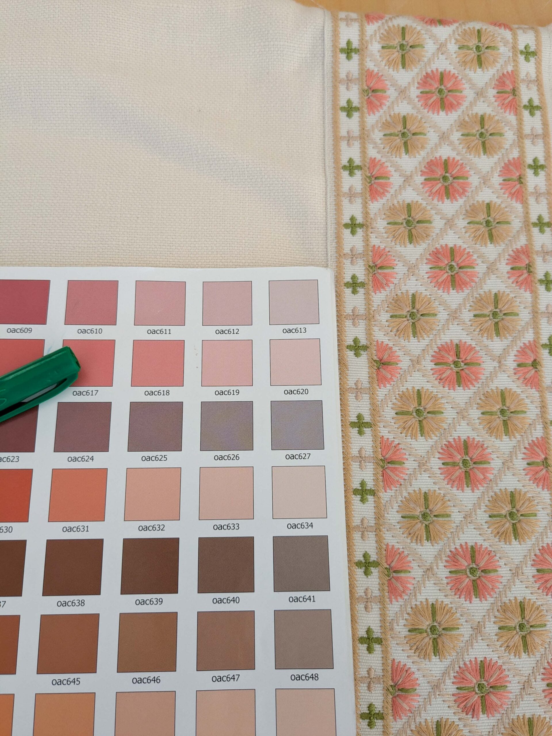 Our tape is crafted with elegant viscose embroidery on linen-and-cotton ground to replicate the armor’s detailing, and uses a tone-on-tone palette to create both contrast and consistency.
