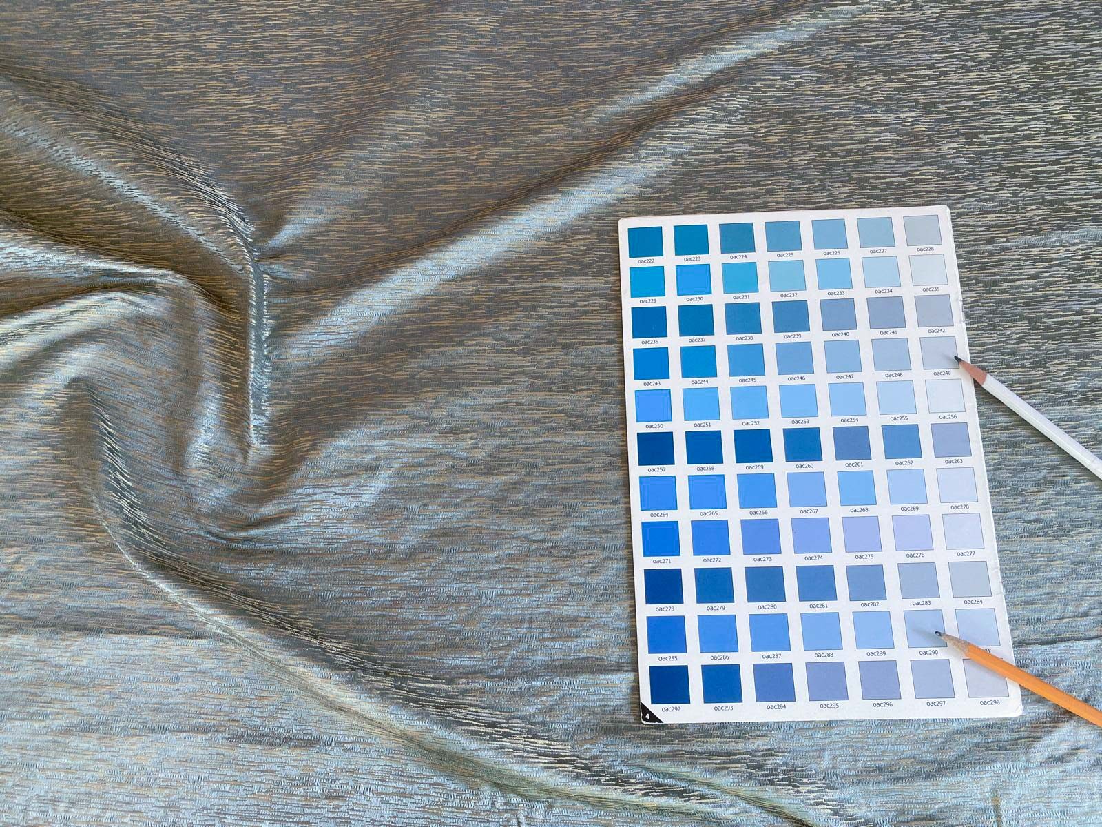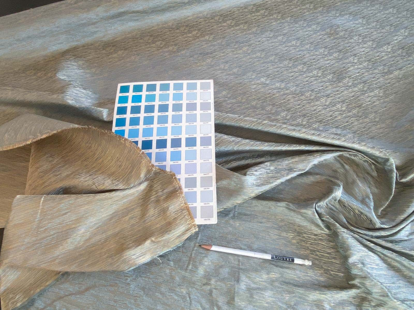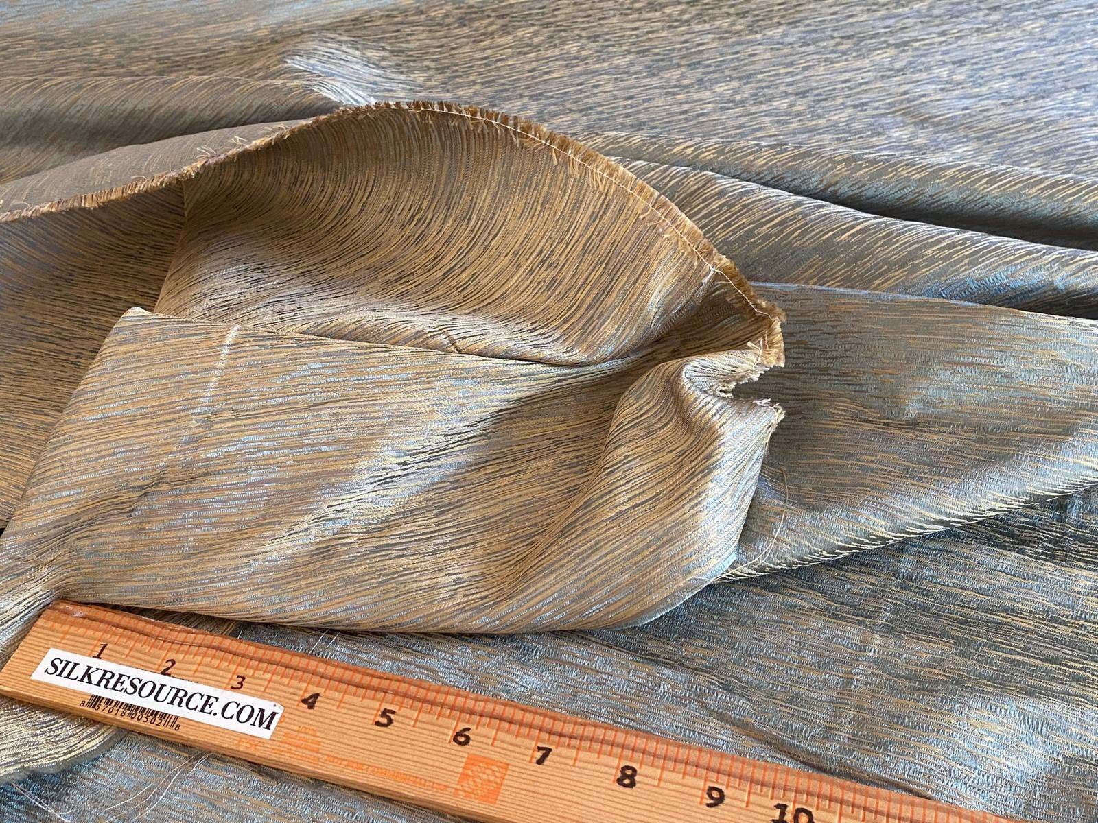 The name of "Essentia" is somewhat misleading because this silk is nothing but "basic" or "regular"! Yarns were made into different colors, thickness and shape before they were put onto the machine. The end result? A pebbled, iridescent and highly metallic piece of art.