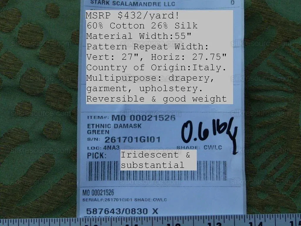 By yard Scalamandre Ethnic Damask Green Cotton Silk Lampas African Abstract MSRP USD 432/Y